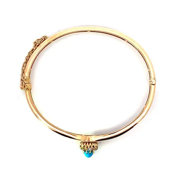A beautifully made antique rose gold bangle featuring a central turquoise cabochon framed with mine cut diamonds. Hinged bangle with a box clasp.