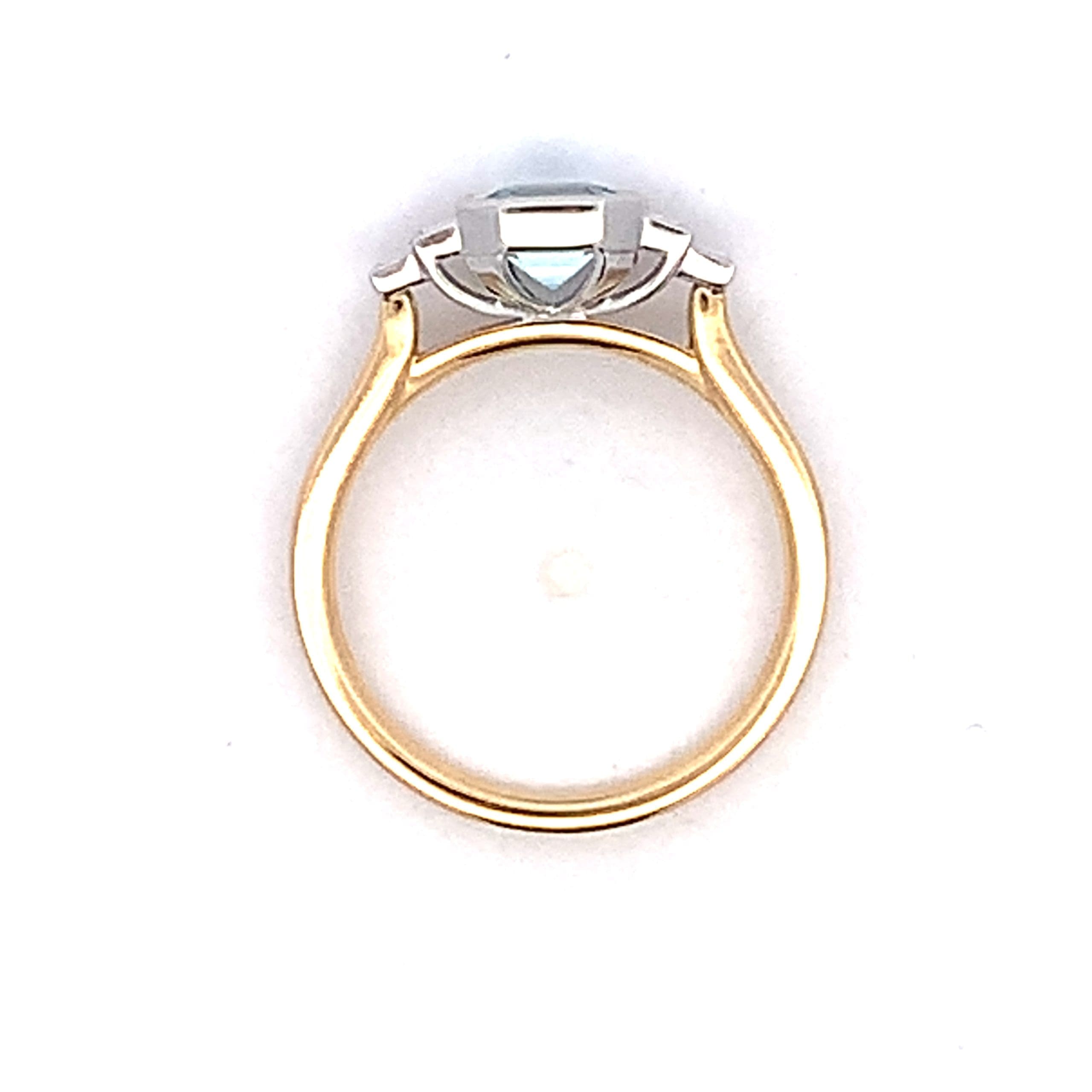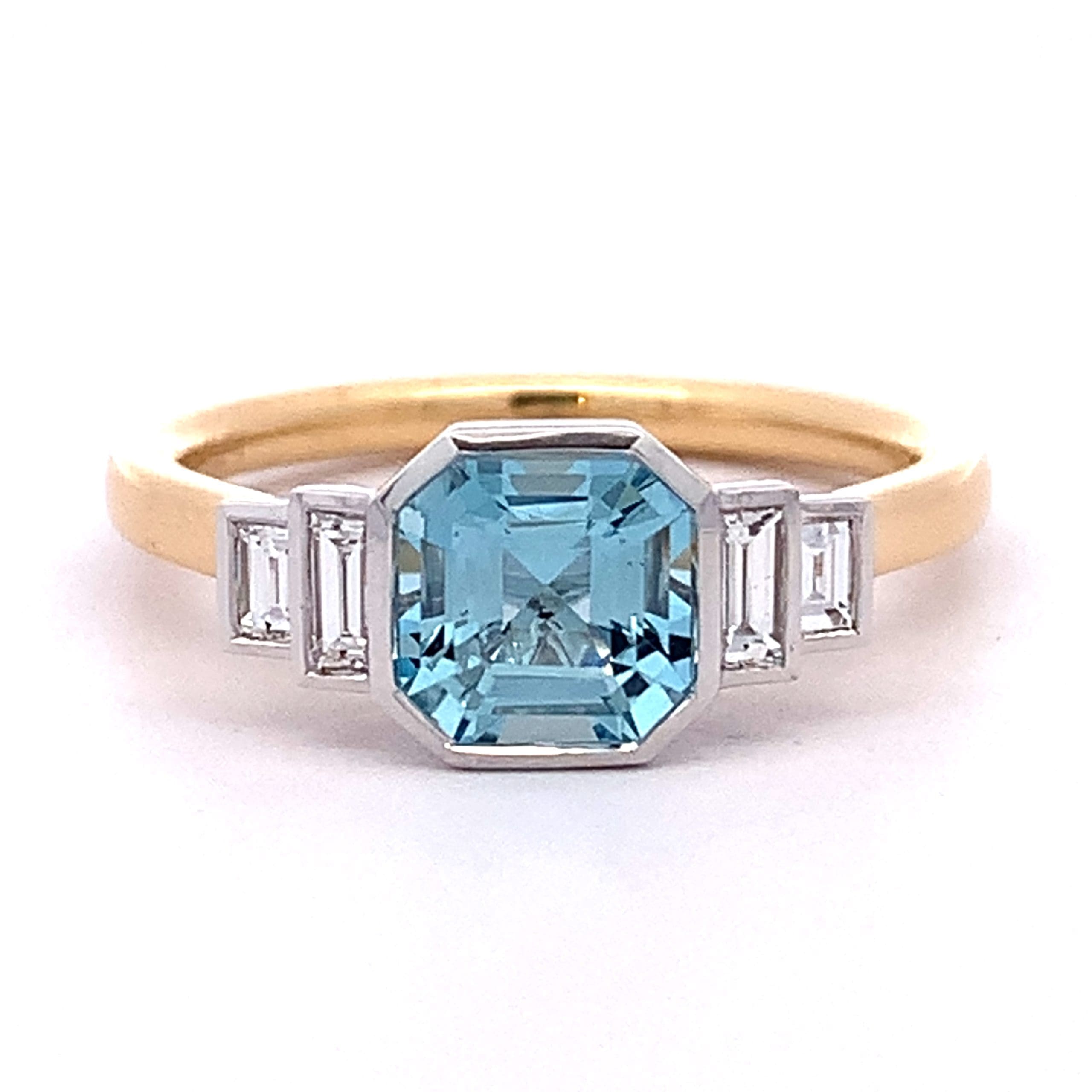 A beautiful deco style ring with square cut aquamarine and baguette cut diamond rub-over set in a white gold exquisitely designed setting. This is a wedfit ring made to allow a band to sit neatly alongside.
