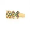 A smooth top chequer board design dress ring set with square cut aquamarine and three oval cut green amethysts.