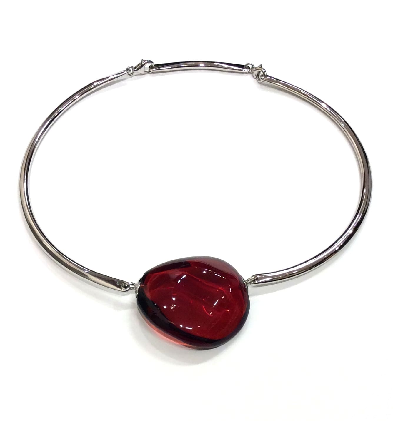 A striking sterling silver necklace by Baccarat comprising a pebble shaped red glass pendant and a strong silver bar collar with an extension piece.