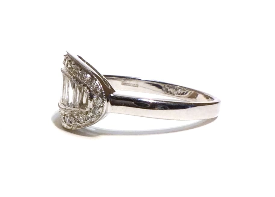 This pretty low profile ring features a row of graduated baguette cut Diamonds encircled by pave set round Diamonds.