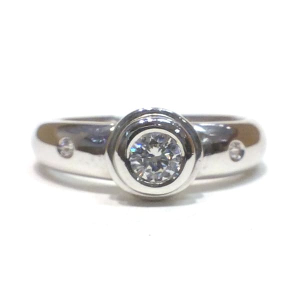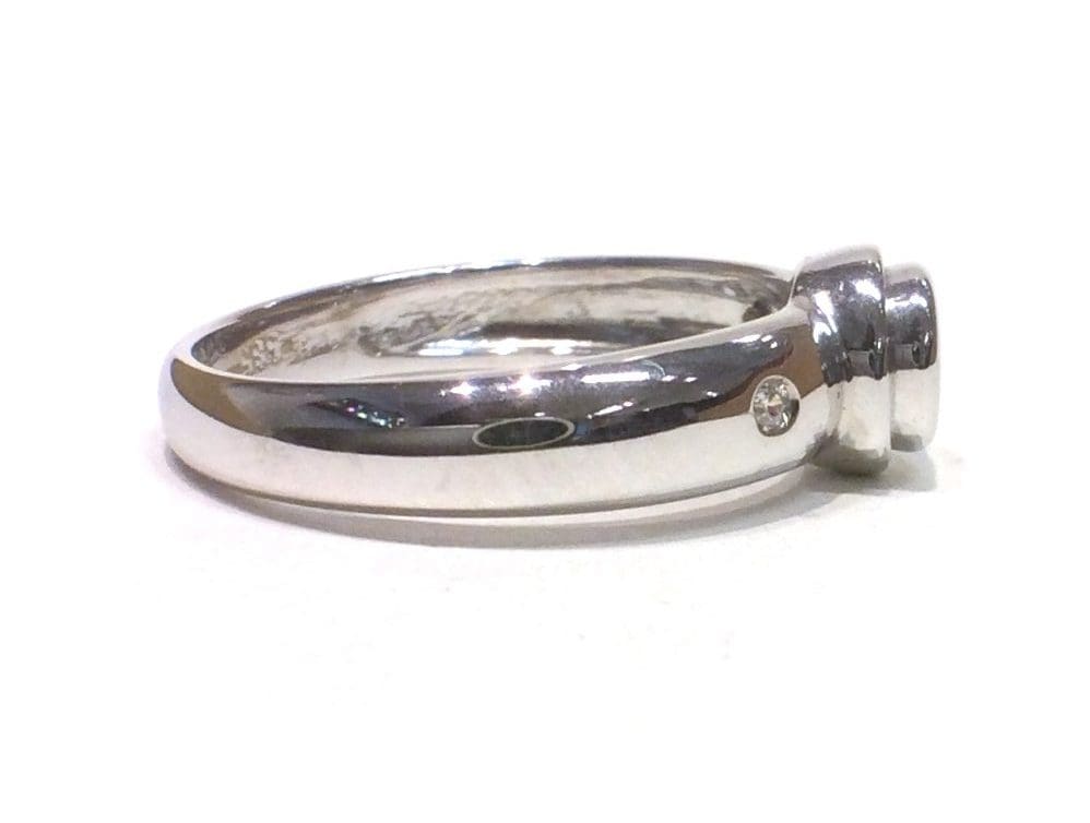 This modern white gold solitaire ring has a central Cubic Zircon in a tiered rubover setting with a single inset round cut Cubic Zircon on each shoulder.