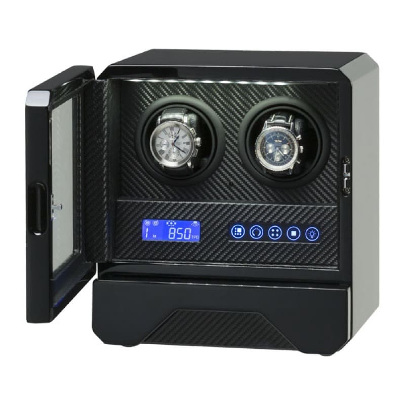 In common with other models in the Barrington watch winder range, each rotor in our 2 watch winder is individually programmable with variable settings (anti-clockwise, clockwise and alternating rotation) and the ability to set the number of turns per day to 650, 750, 850, 1000 or 1950 rotations. Featuring ultra-quiet Japanese motors, a remote control and digital display, the unit is set in a carbon fibre-effect backdrop with LED downlighters and a built-in storage drawer, ideal if you have extra watches to accommodate.