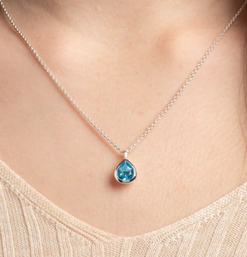 Drop-shaped pendant made of polished and satin matt 925/- sterling silver with a beautiful blue topaz (1,54ct) with many single sparkling facets.