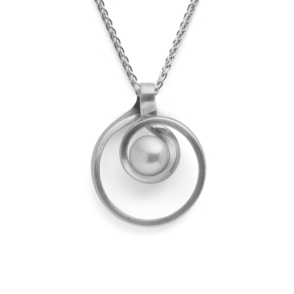 Timelessly elegant: This jewellery piece made of rhodium-plated 925/- sterling silver captivates with a shimmering freshwater cultured pearl, which lies in a curvy shaped pendant. A goldsmith’s must-have by designer Sabine Brandenburg-Frank.