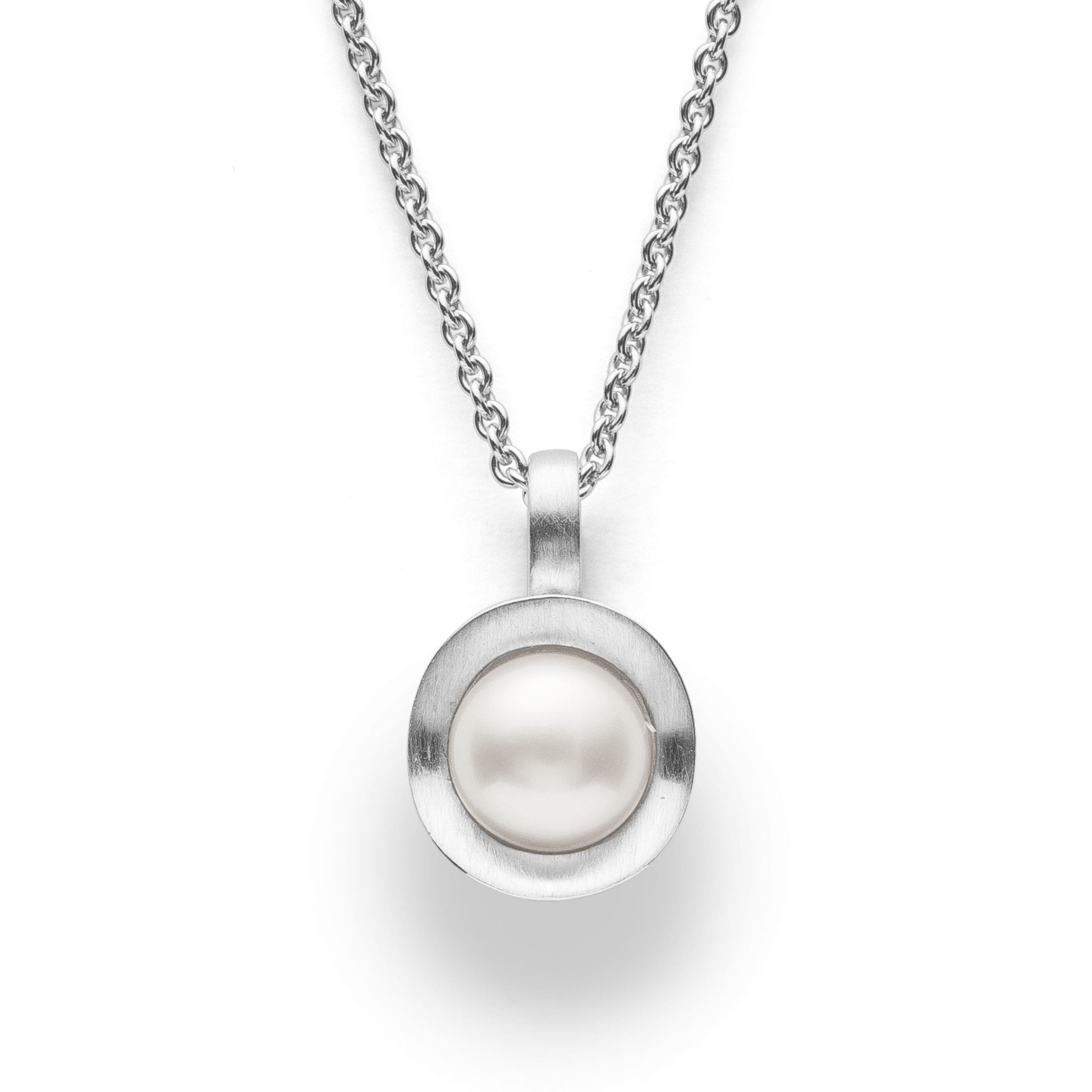 Shimmery cultured white freshwater pearl meets satin matt sterling silver: a classical and timeless combination of high quality materials which come to retribution through the massive processed pendant and its rhodium plating. Matching ring and ear studs are available.