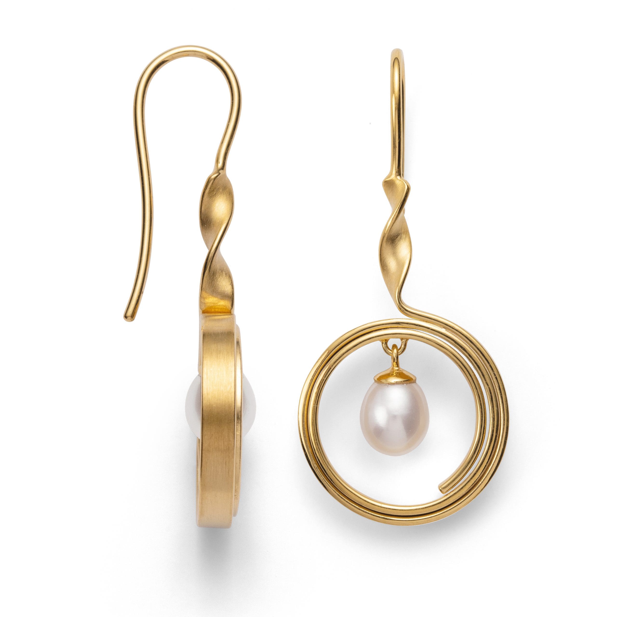 Gold-plated 925/- sterling silver meets two white, freely swinging cultivated pearls. The romantic, playful design makes these handcrafted earrings created by designer Dietmar Sebastian real eye-catchers