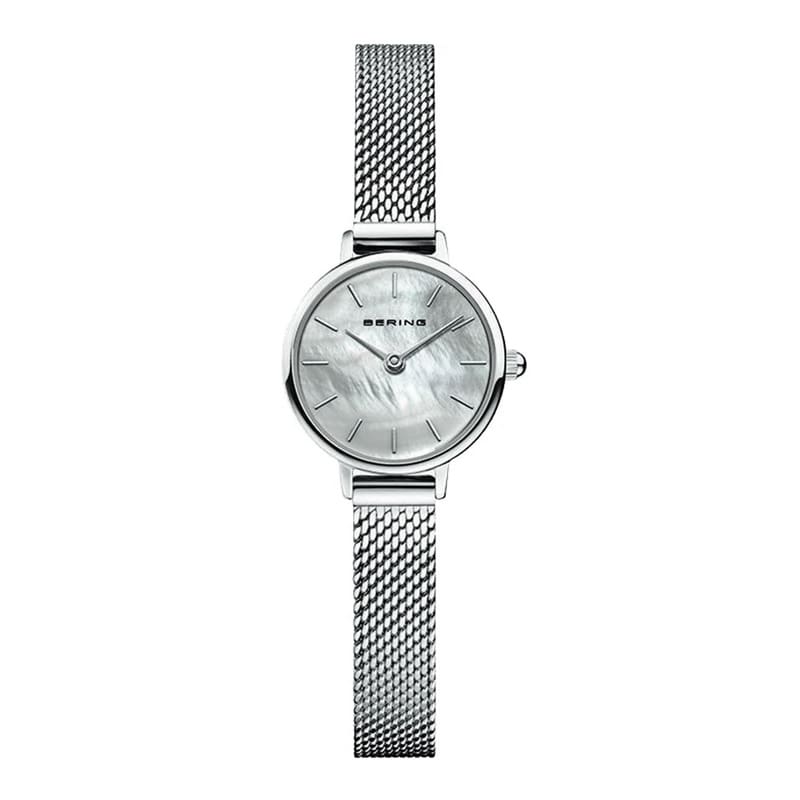 The simple smooth case is made from polished stainless steel. Under the crystal clear, hard and scratch-resistant sapphire crystal is a mother of pearl dial with silver coloured indices and hands, ensuring an elegant and sophisticated appearance. With a stainless steel slim milanaise strap.
