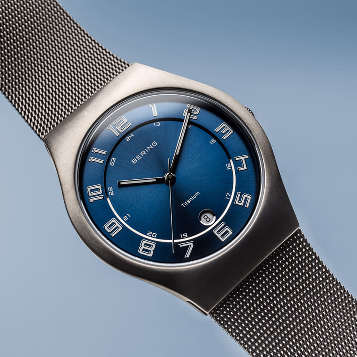 The brushed grey coloured TITANIUM case, in combination with the modern Milanese mesh strap ensures optimal wearing comfort and the classic BERING look. The fine workmanship of the Milanese mesh strap gives the watch a refined, almost noble touch. The flawless blue coloured Sunray dial with integrated date window and strikingly coloured indices emphasizes the modern look. An especially hard, crystal clear and scratch-resistant sapphire crystal ensures a clear view of the exquisite dial.