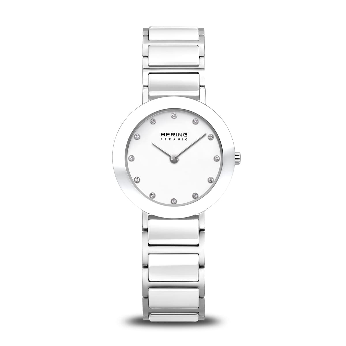 The polished silver coloured stainless steel case, made of pure, high quality, medical-grade stainless steel (316L), elegantly and seamlessly frames the white coloured dial. This is protected by an especially hard, crystal clear and scratch-resistant sapphire crystal. The sleekly burnished “Smooth Touch” finish of the ceramic, which makes the material soft to the touch, and the sparkling Zirconia elements on the dial complete the look of Nordic beauty.