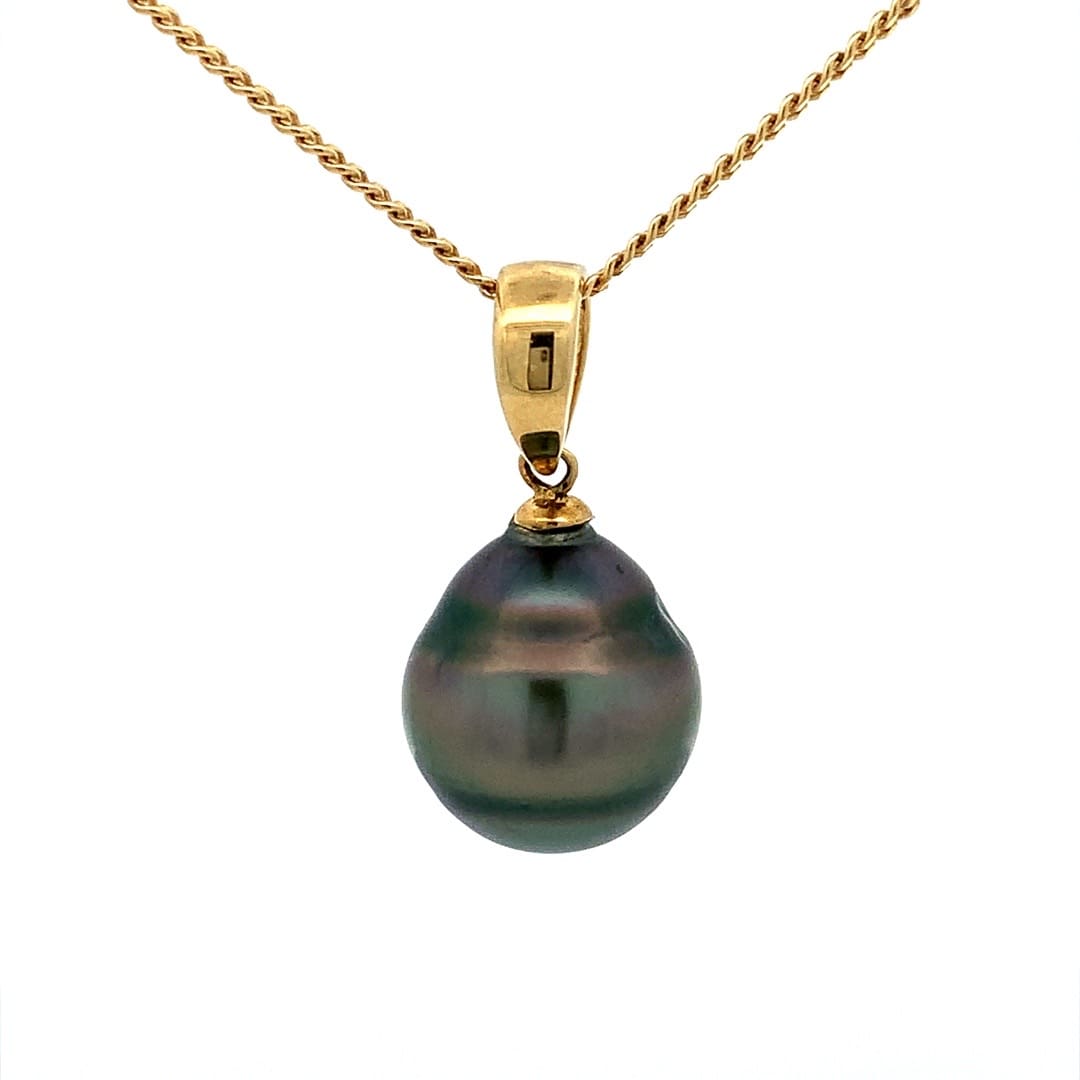 A natural ‘black’ pear shape cultured pearl fitted to a generous gold bale – paired with an adjustable flat curb chain.
