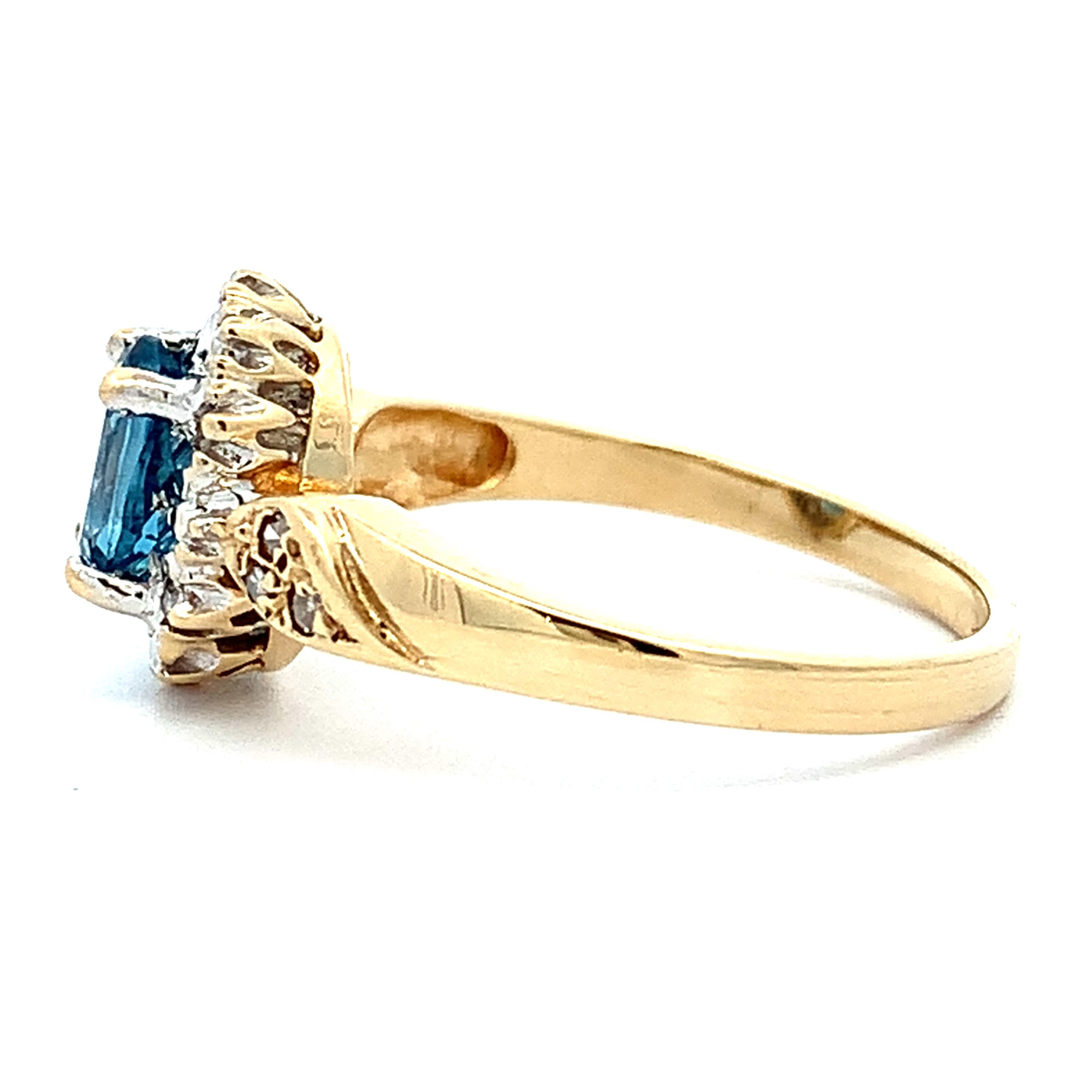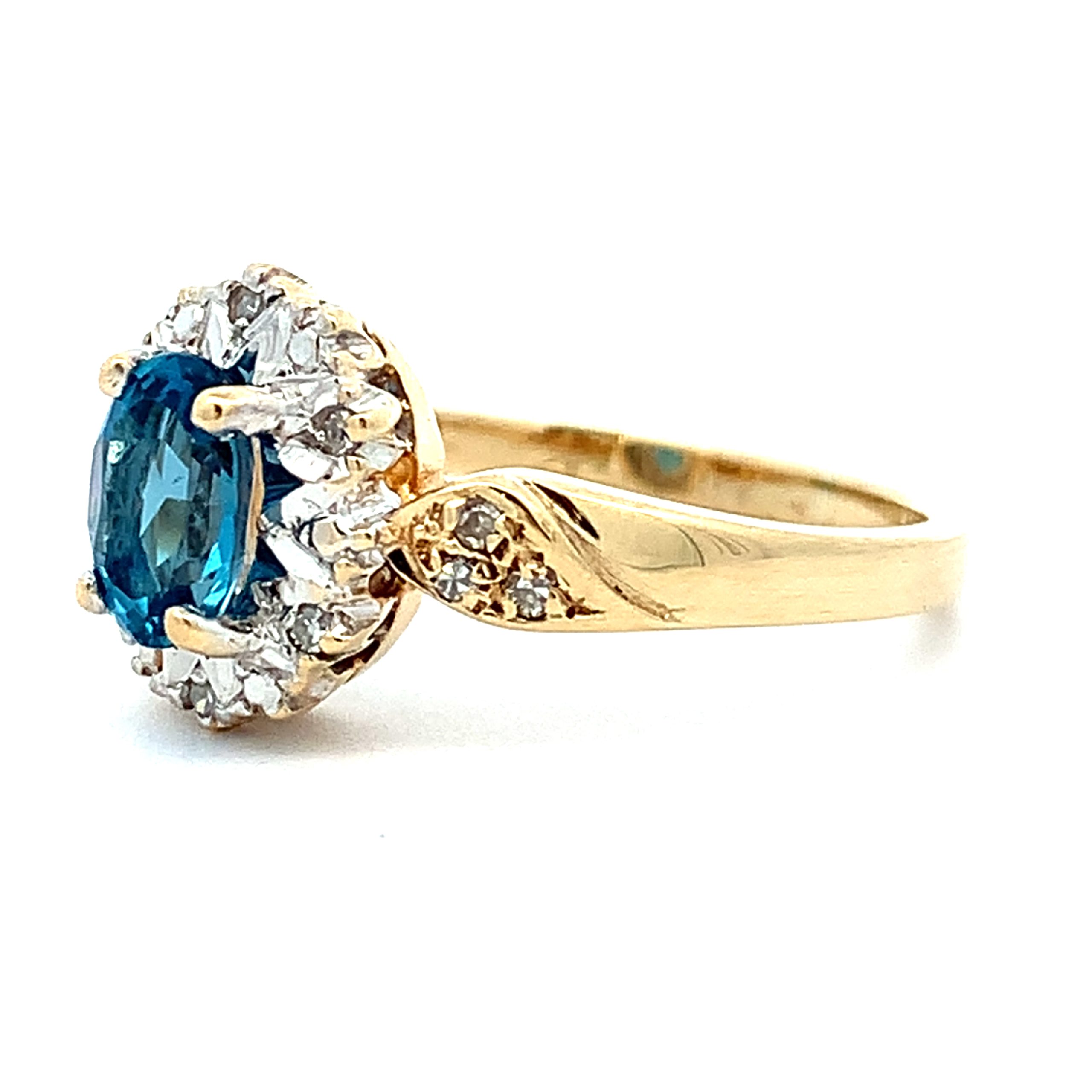A pretty 9 carat gold dress ring claw set with an oval faceted London blue topaz and round cut diamonds in the shoulders and white gold illusion frame.