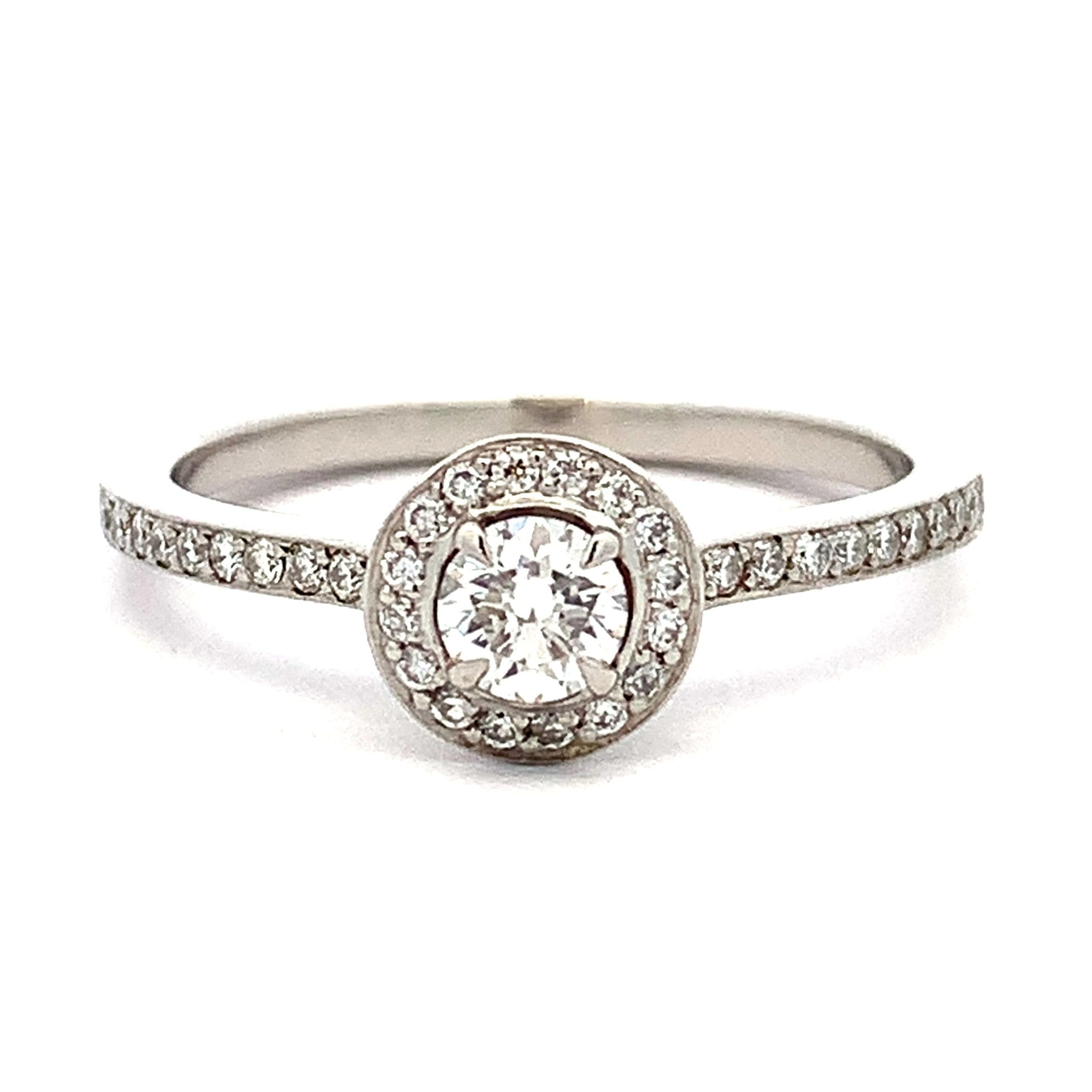 This beautiful platinum halo design ring has a bright round brilliant cut centre diamond above a diamond pave frame and diamond pave shoulders. This ring is designed with a raised undersetting to allow a band to sit neatly against the strong ring shank. In excellent condition – comes in original Boodles ring box.
