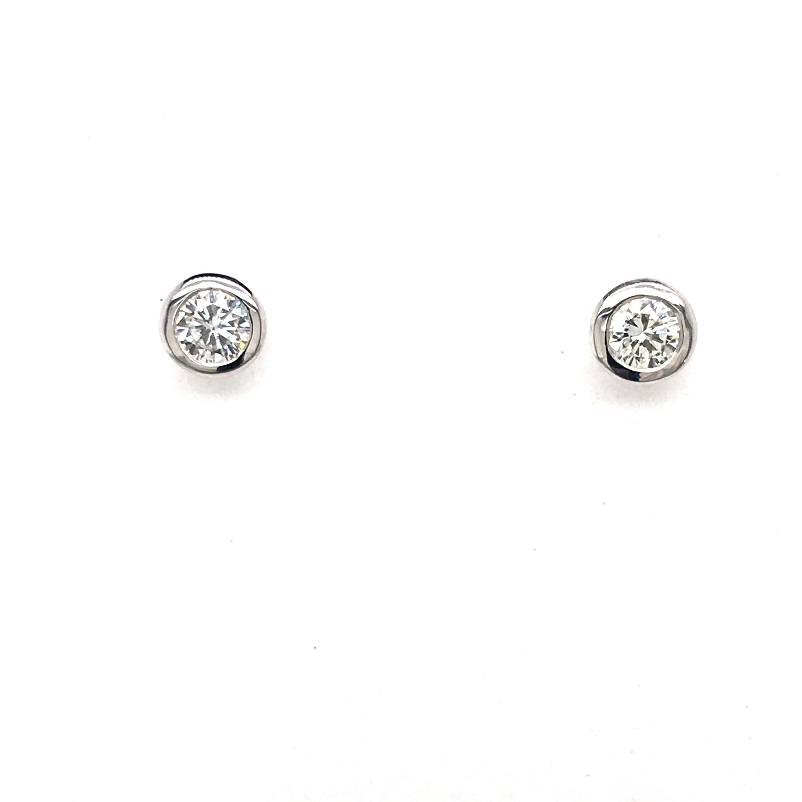 A delicate pair of white gold stud earrings, rub-over set with round brilliant cut Diamonds, designed to sit flush to the ear.Metal: 18 Carat White GoldTotal Diamond Weight: 0.42 CaratDiamond Colour: G/H Clarity: SIDiameter: 5.5 mmFittings: Posts and Scroll BacksGift Boxed