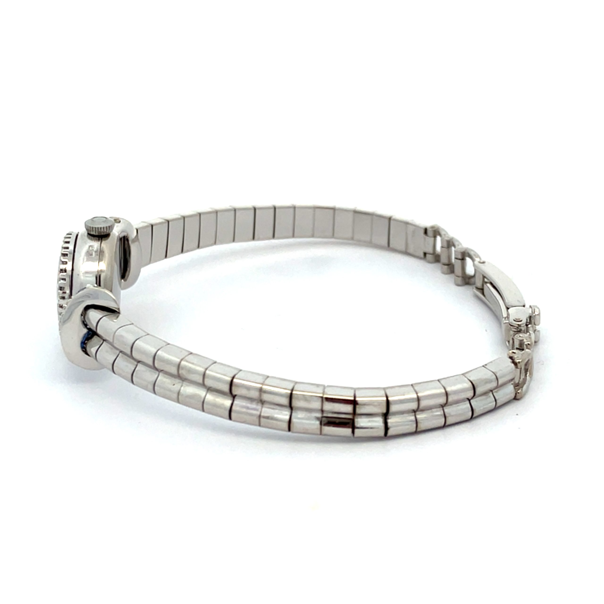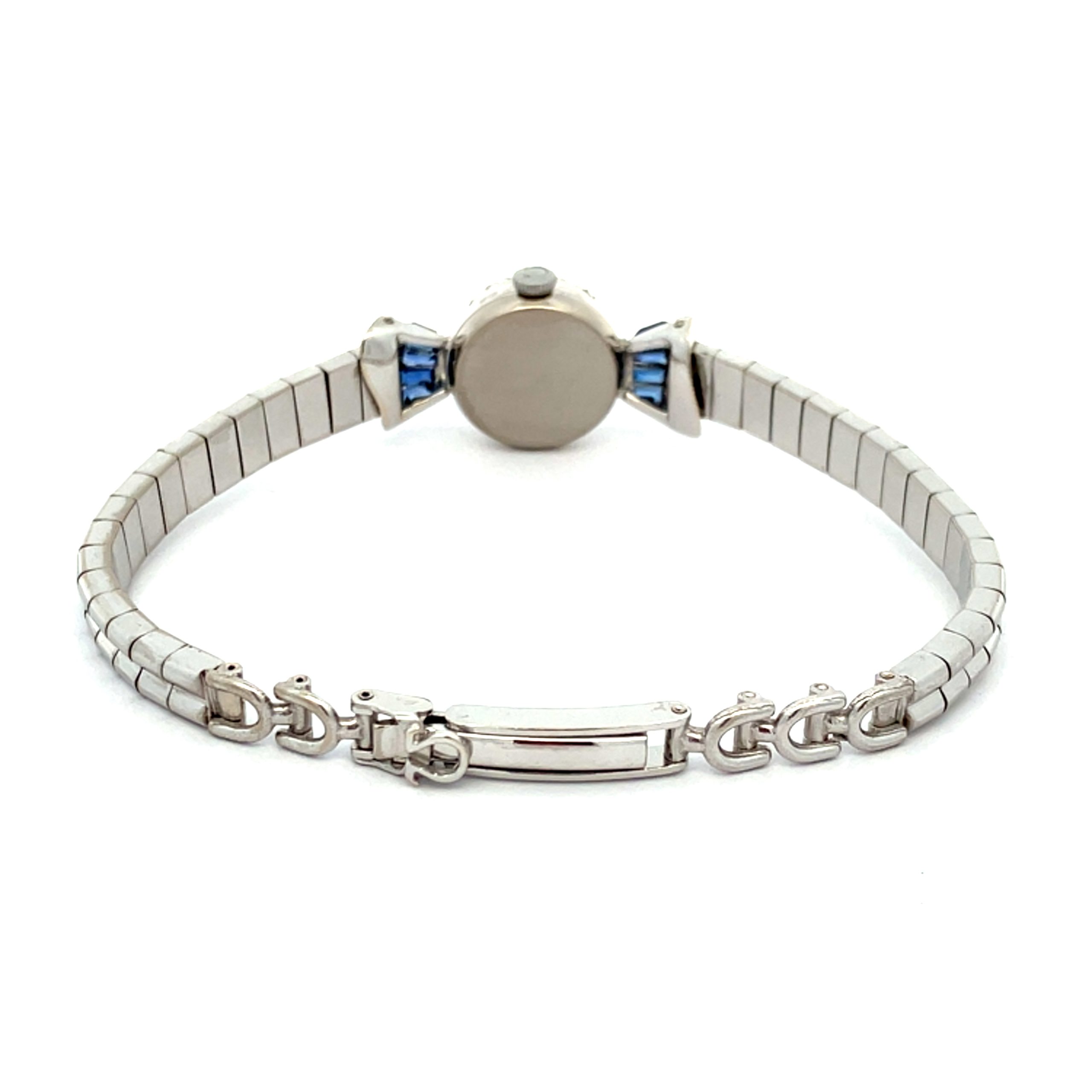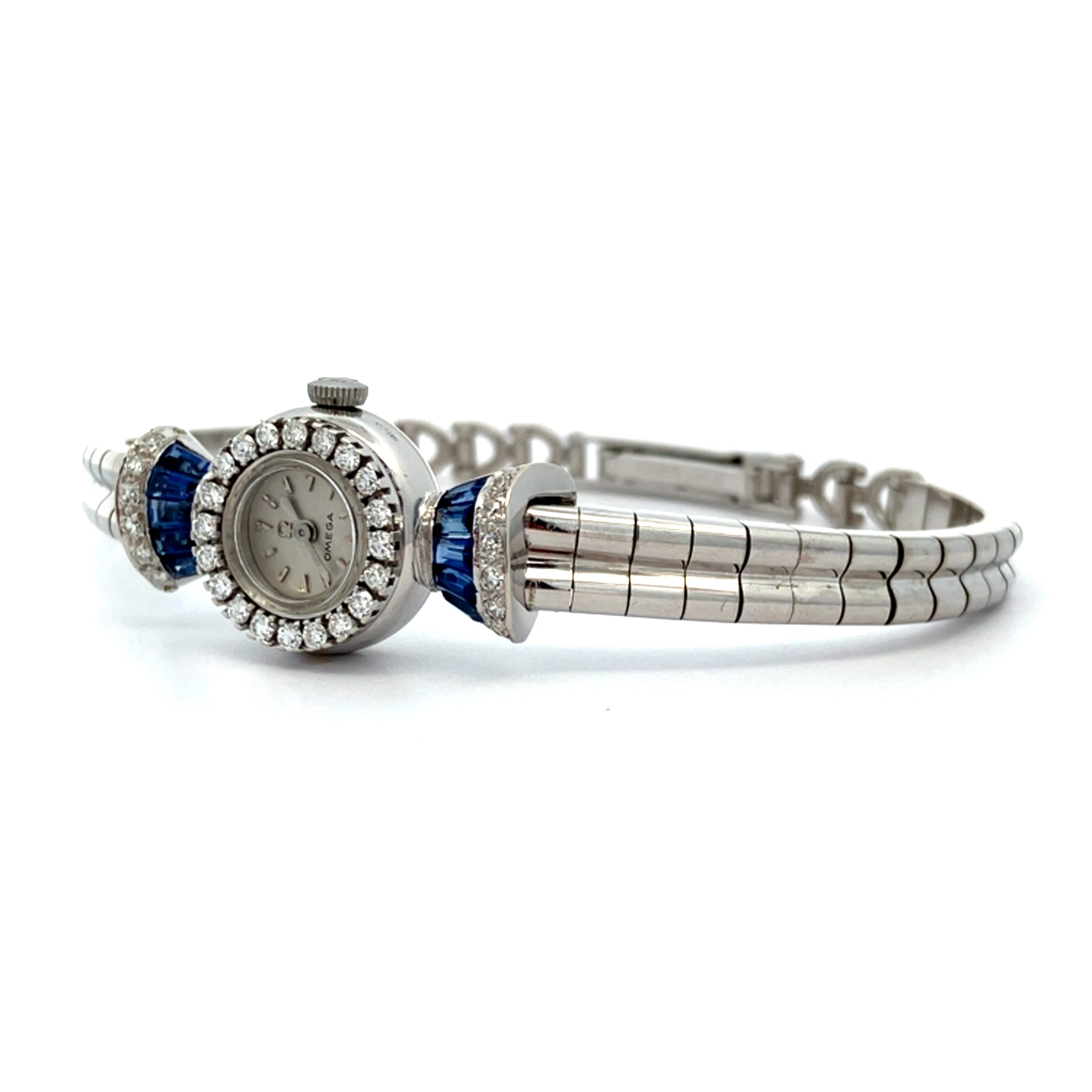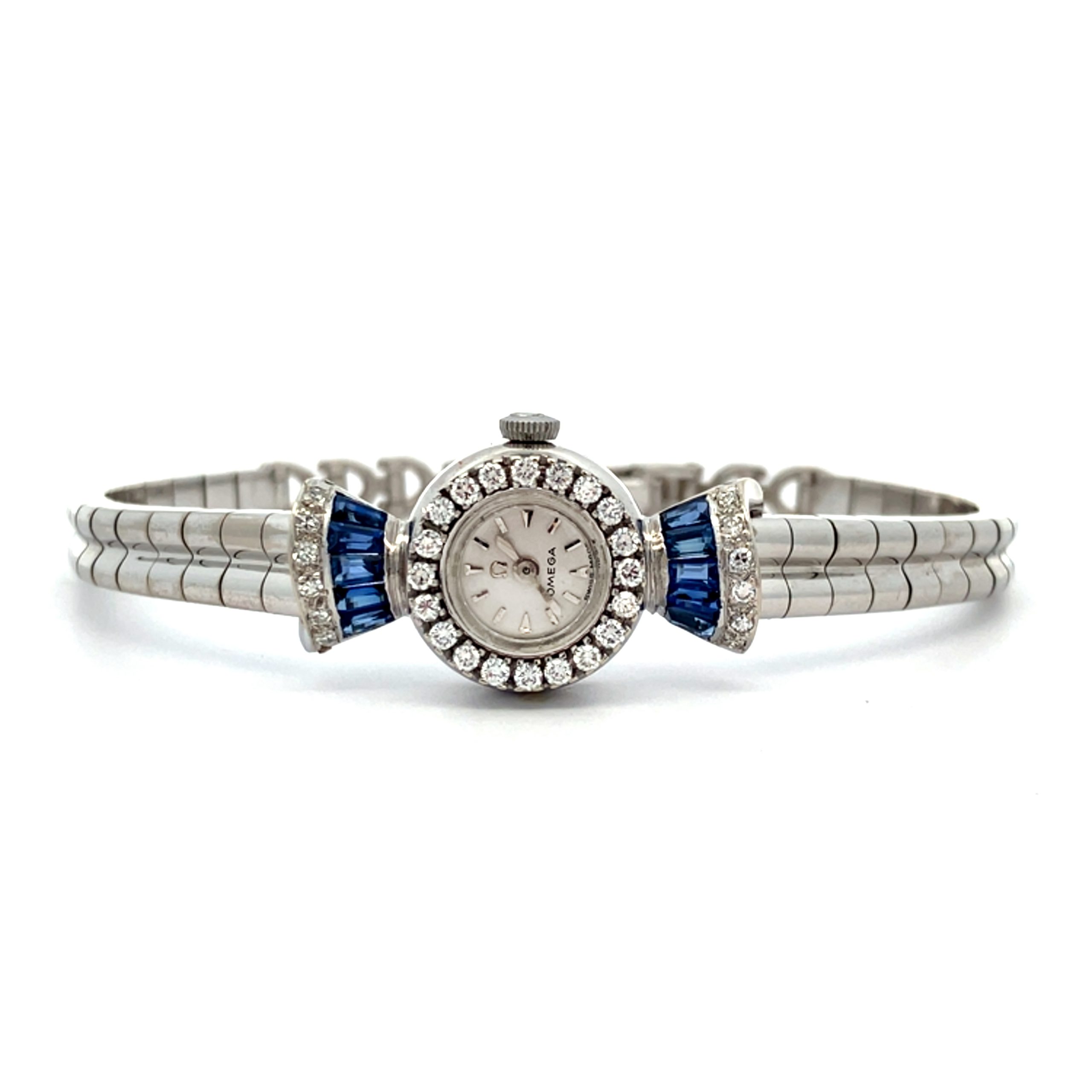 A superb vintage ladies Omega cocktail watch with an elegant 18ct solid gold case and bracelet. The bow shaped case is set with calibre cut vivid blue sapphire and round brilliant cut diamond. Polished white gold hands and hour batons over a matte silver dial. Powered by a hand-wound mechanical movement.