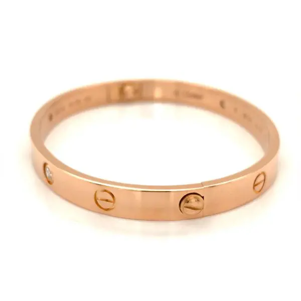 This is a genuine Cartier Love bracelet in 18 carat rose gold and set with four brilliant cut diamonds. A close fitting, oval bracelet composed of two halves, fitted and removed using a screwdriver. The closure is designed with a screws on either side of the bracelet: you should have help to open or close it.