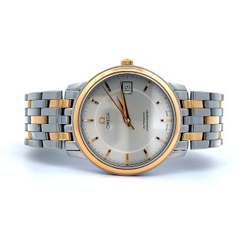 Ladies stainless steel Cartier Santos Demoiselle quartz watch in stainless steel and 18 carat gold. With square white dial featuring black roman numerals and blue steel sword shape hands. Sapphire crystal glass and blue cabochon set crown. Snap down bi-fold clasp. This is a shorter length bracelet – approximately 16cm.