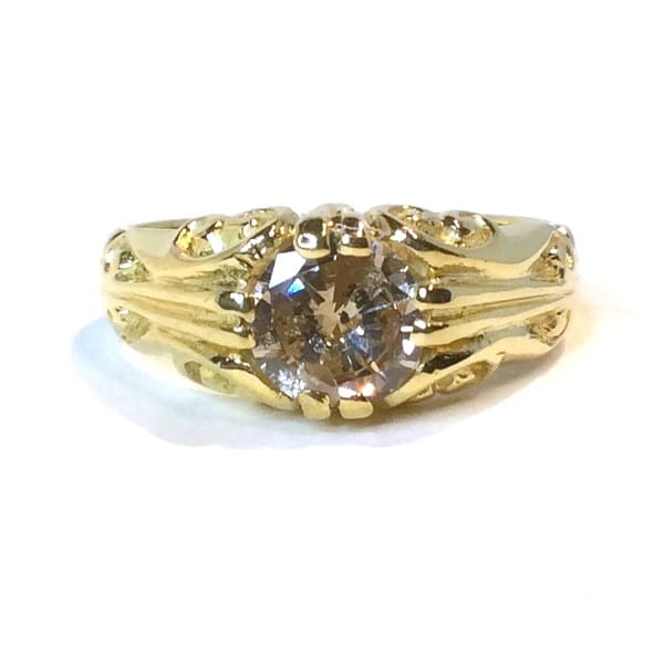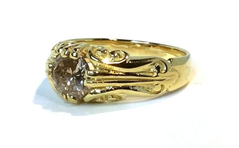 A vintage style yellow gold ring set with a large modern cut Diamond.