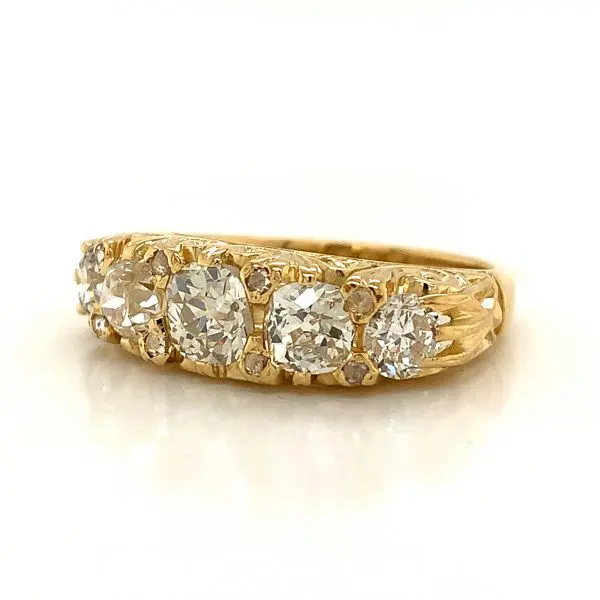 A stunning traditional scroll carved ring set with five large old cut diamonds and eight small rose cut diamonds.
