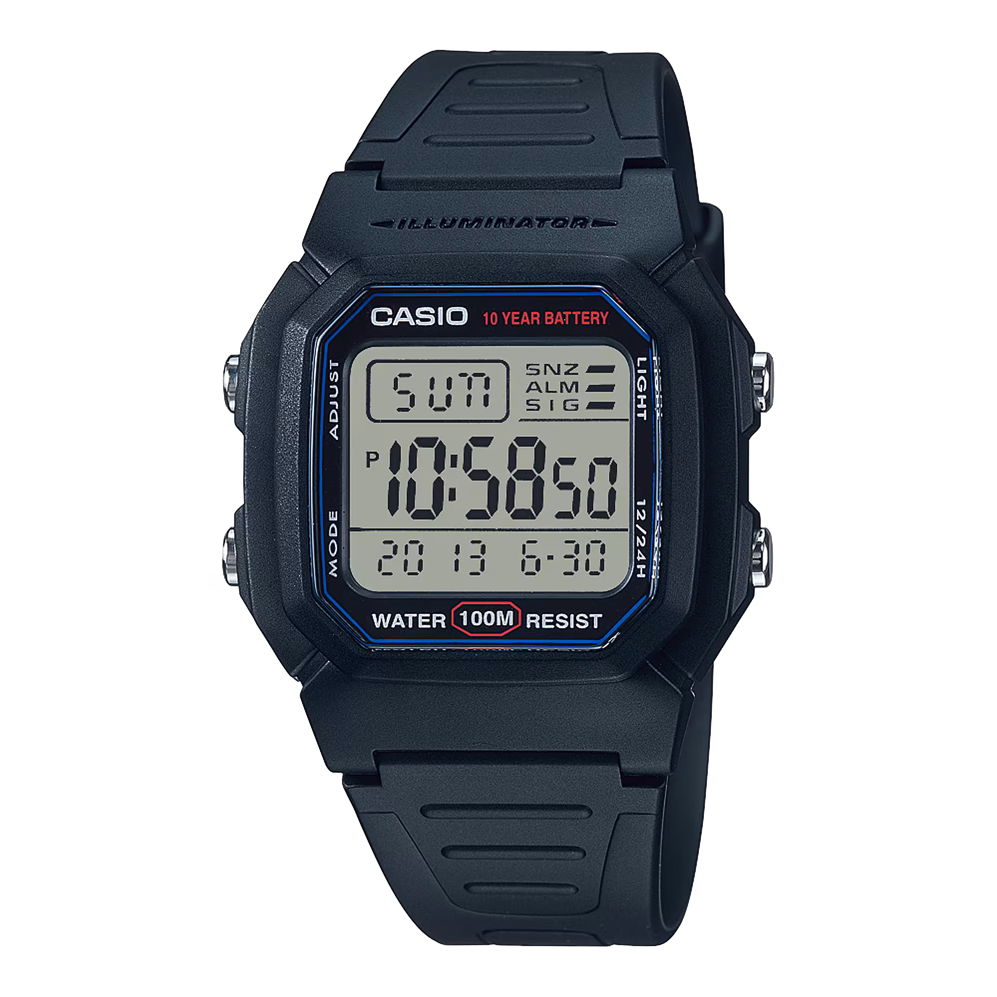 This CASIO watch has a classic digital display, a dual time function and a stopwatch. The display is lit by an LED backlight for optimum visibility and the watch is housed in a durable resin case, water resistant to 100M. Suitable for sport and everyday styling.
