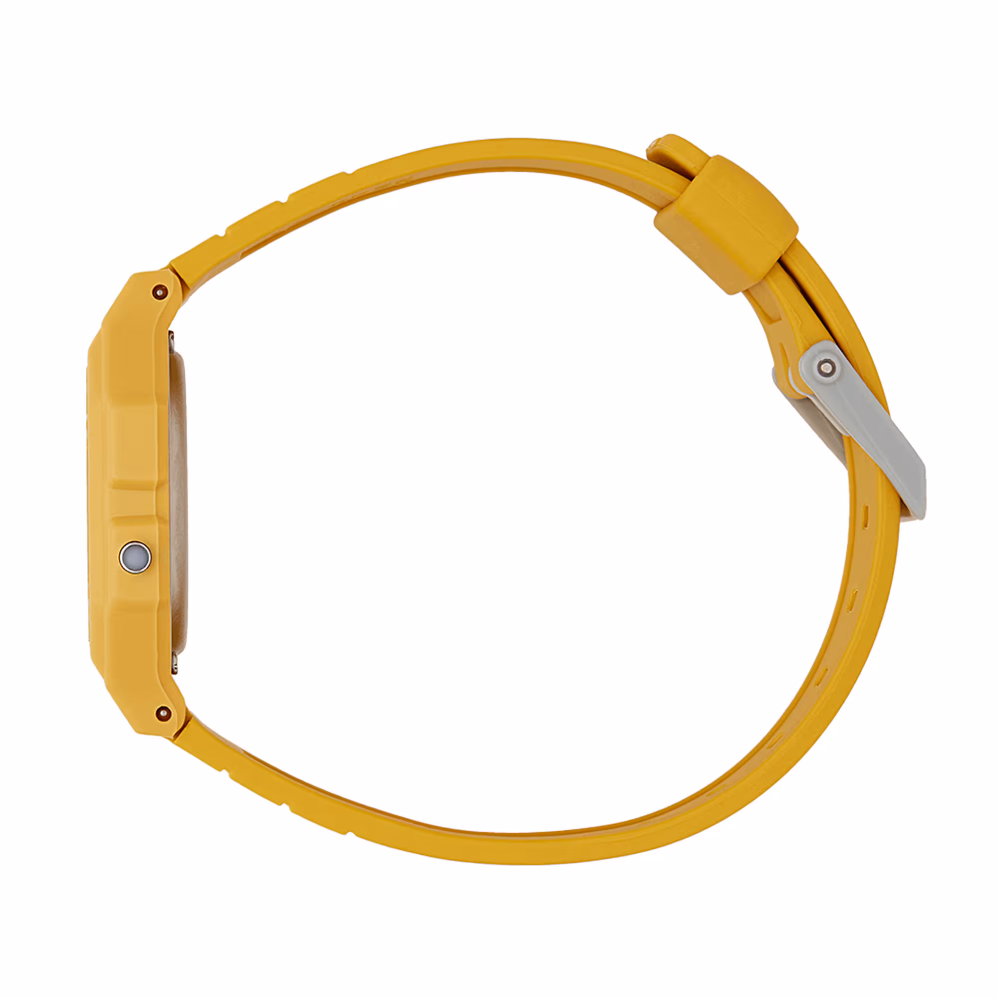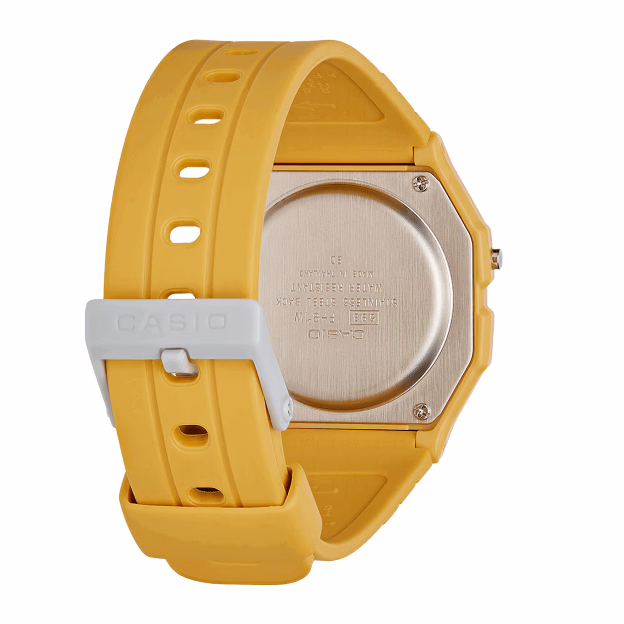 The original shaped iconic Casio watch. Featuring a digital display, 100th sec stopwatch, alarm and a microlight, this classic timepiece is suitable for every occasion and is finished in a cool yellow tone.