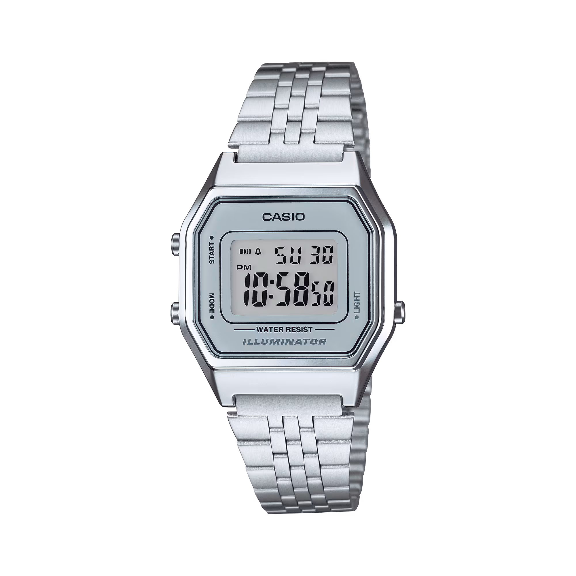 A stylish update of a classic Casio design, this Vintage retro timepiece is built for now. The watch features a simple fold-over clasp on a stainless steel bracelet, a digital display, stopwatch, and a daily alarm. Perfect for everyday and street styling.