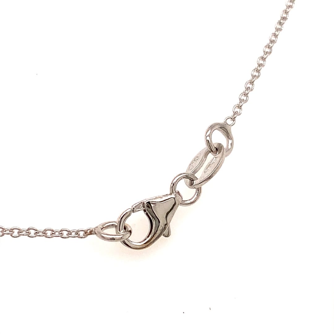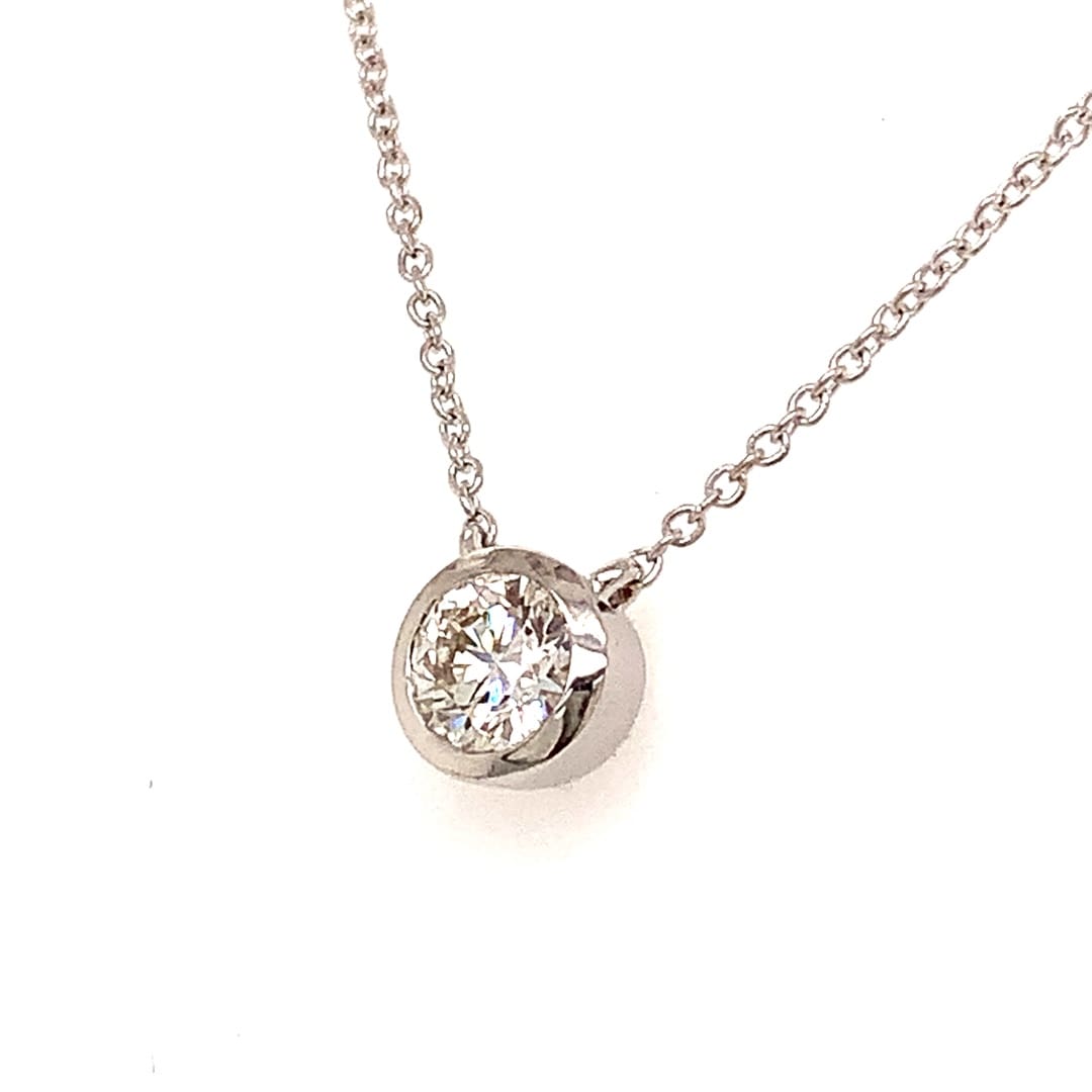 A classic white gold solitaire necklace, with a round brilliant cut diamond in a smooth rub-over setting on a fine trace link chain. This is a high quality, near flawless, certificated diamond.