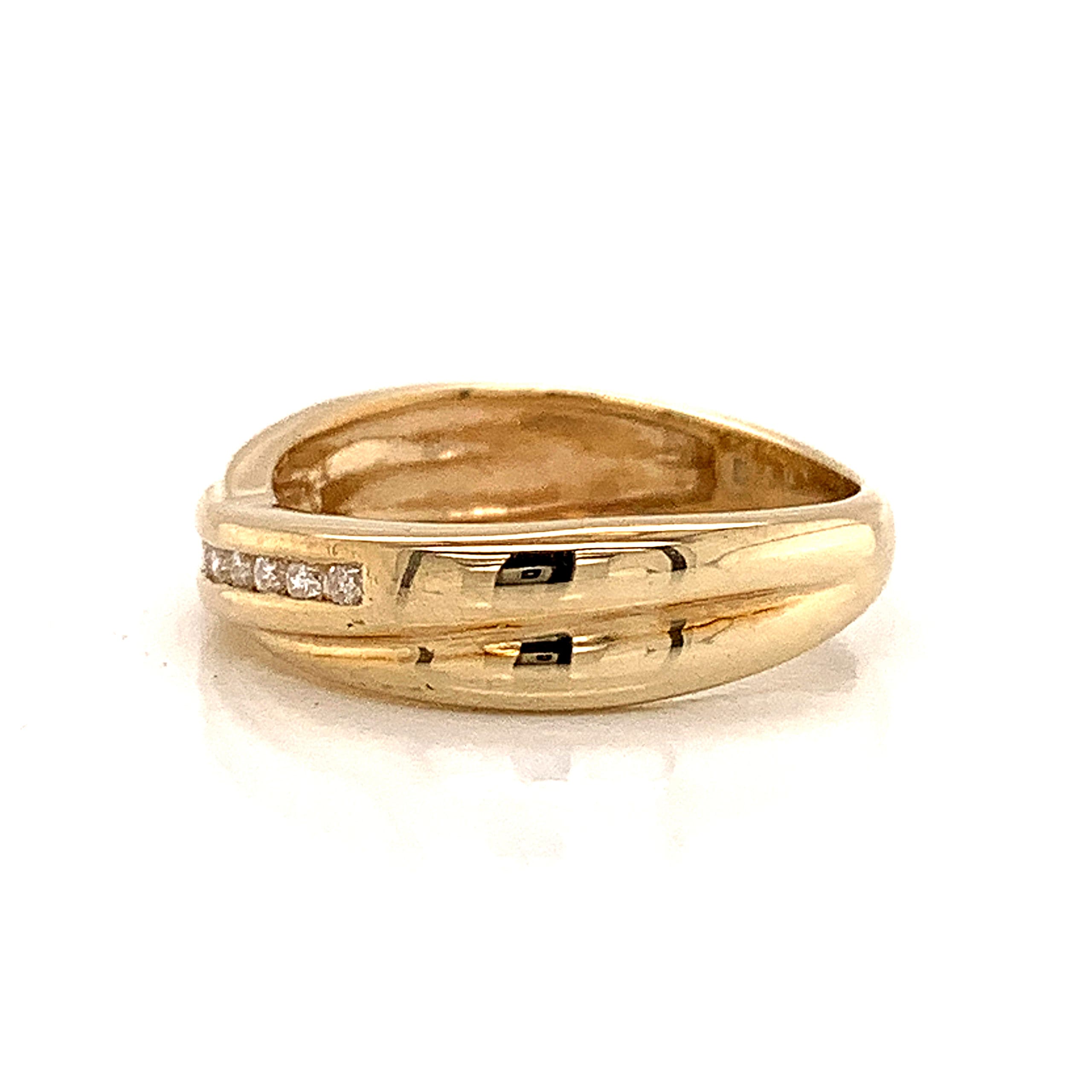 A modern crossed bands design ring channel set with small round cut Diamonds.