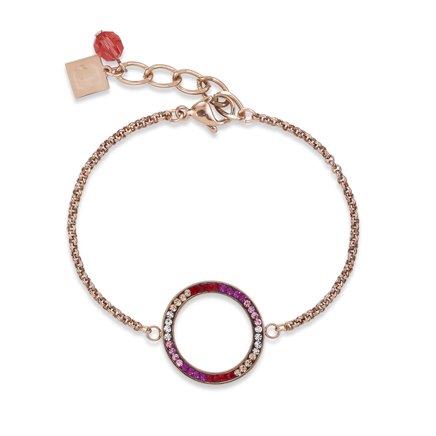A sparkly bracelet with pink shaded crystals on rose stainless steel.