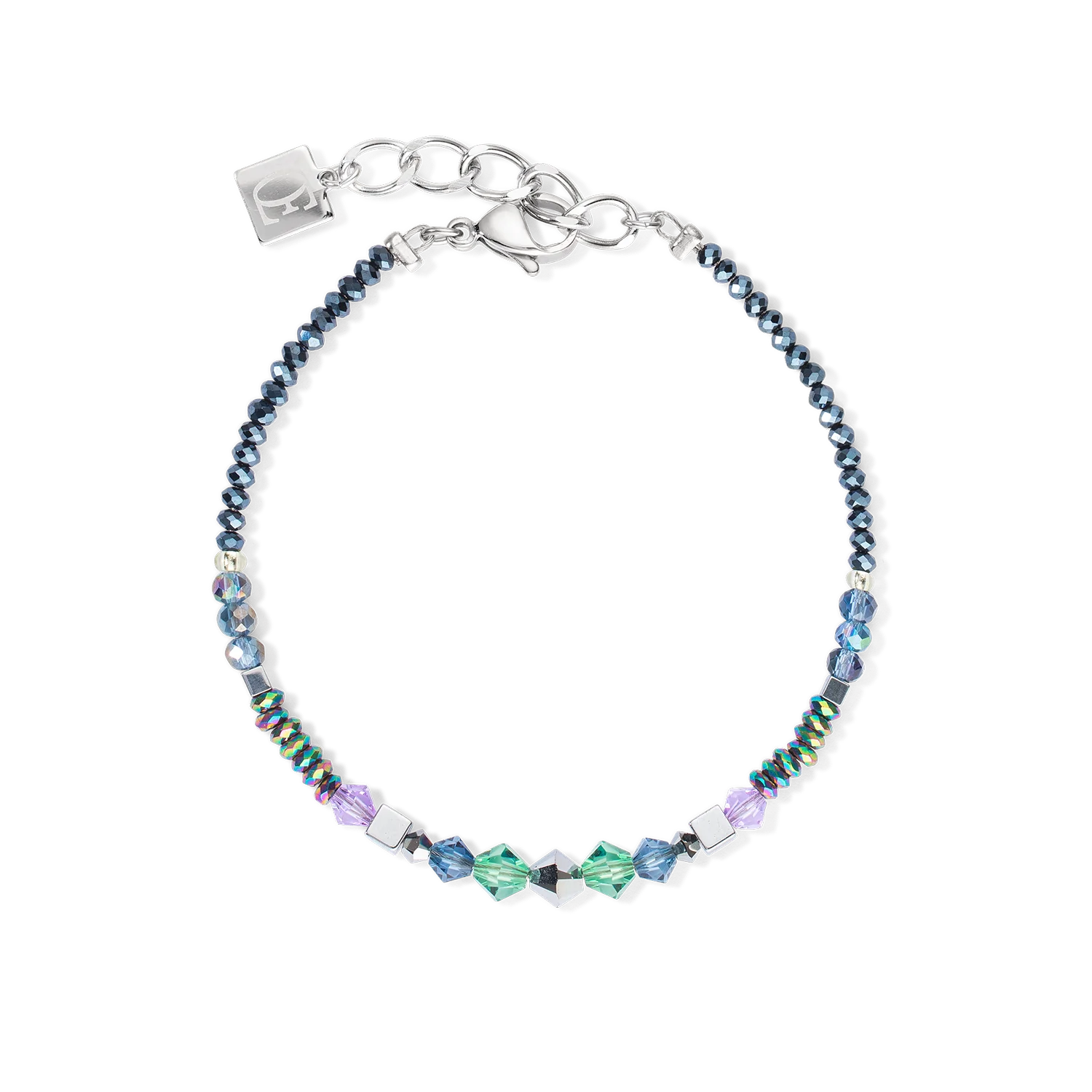 Shimmering crystals in anthracite, blue, green and lilac are twinned with faceted haematite, lending this bracelet a touch of extravagance. Wear it with the matching pendant and earrings for glamorous occasions.