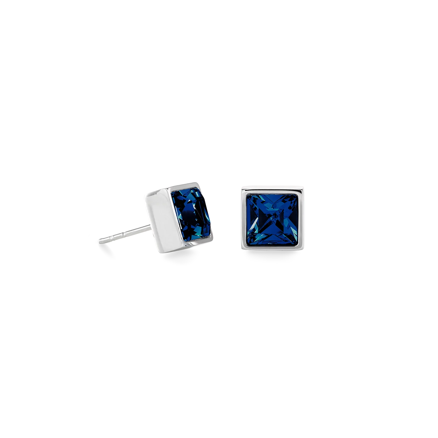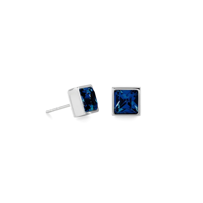 A sparkling pair of midnight blue crystal glass stud earrings in polished stainless steel.