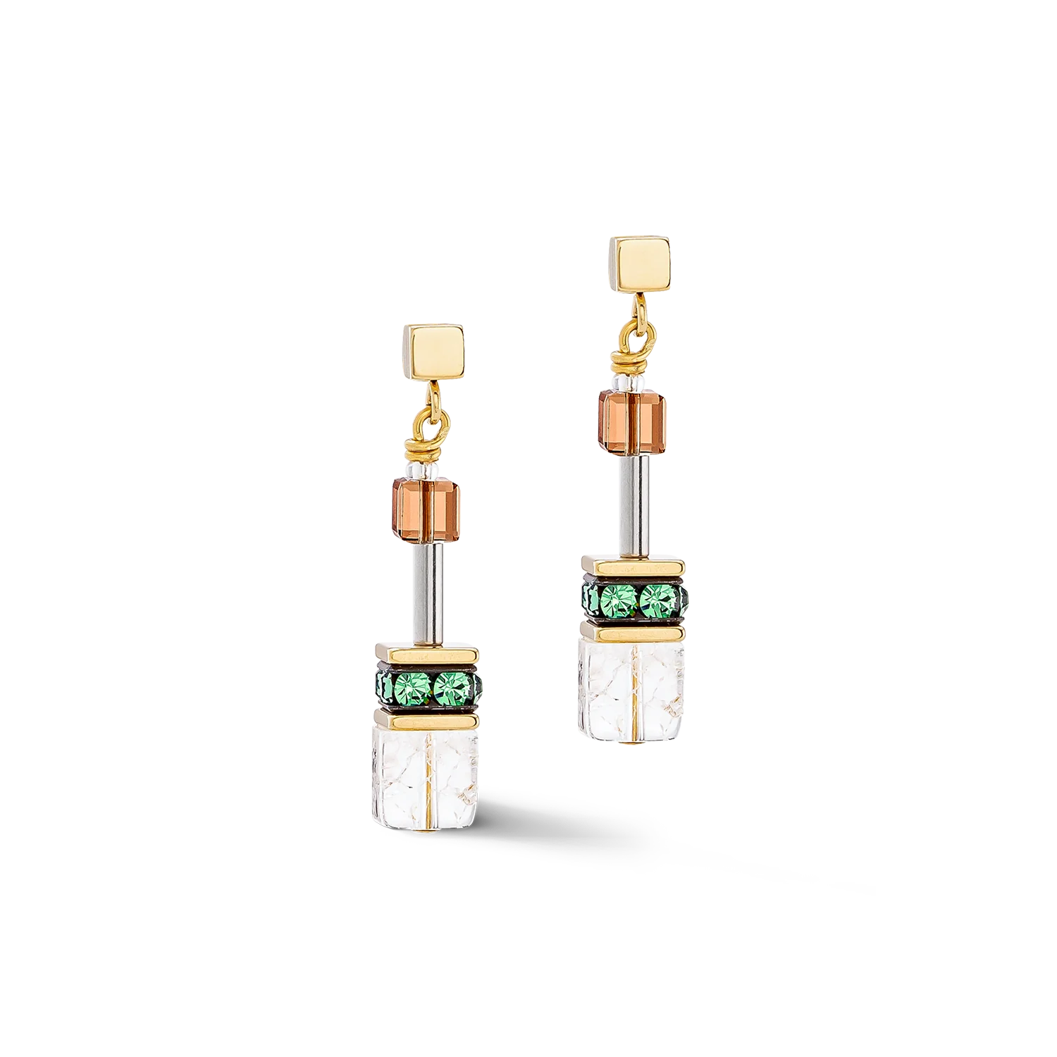 GeoCUBE® Iconic Nature earrings brown and white in gold: glamour meets earthy tones Make a statement with the GeoCUBE® Iconic Nature earrings in brown and white and gold. These earrings combine the warm, earthy colours of the crystals with the unique texture of the cracked rock crystal cubes and the luxurious shine of gold. Inspired by the grounded glamour trend, these earrings bring both elegance and a touch of natural charm to your outfit – perfect for any occasion, whether everyday or for special occasions.