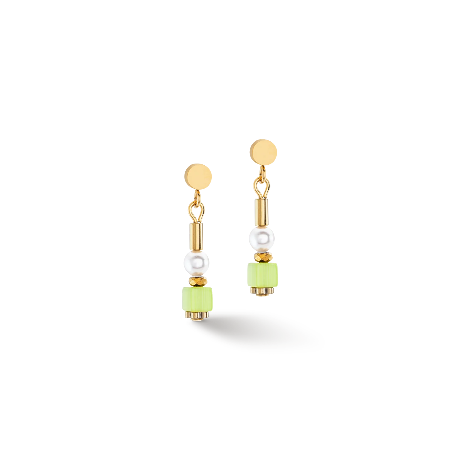 Delicate earrings in a cubes & pearls mix design. Mini cubes in light green and fine crystal pearls combine to create a light, colourful piece of jewellery for every day.