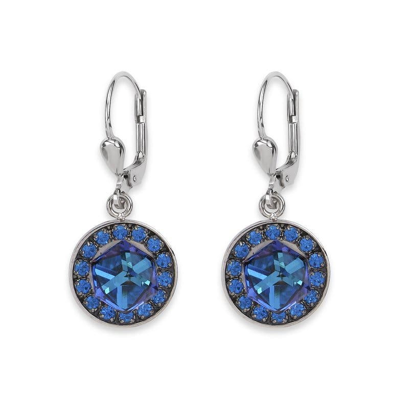 Multifaceted, these earrings down to the smallest detail are designed in most beautiful blues of the season – with pave crystals and central Swarovski crystal cubes. Handmade in Germany with rhodium plated silver lever backs.
