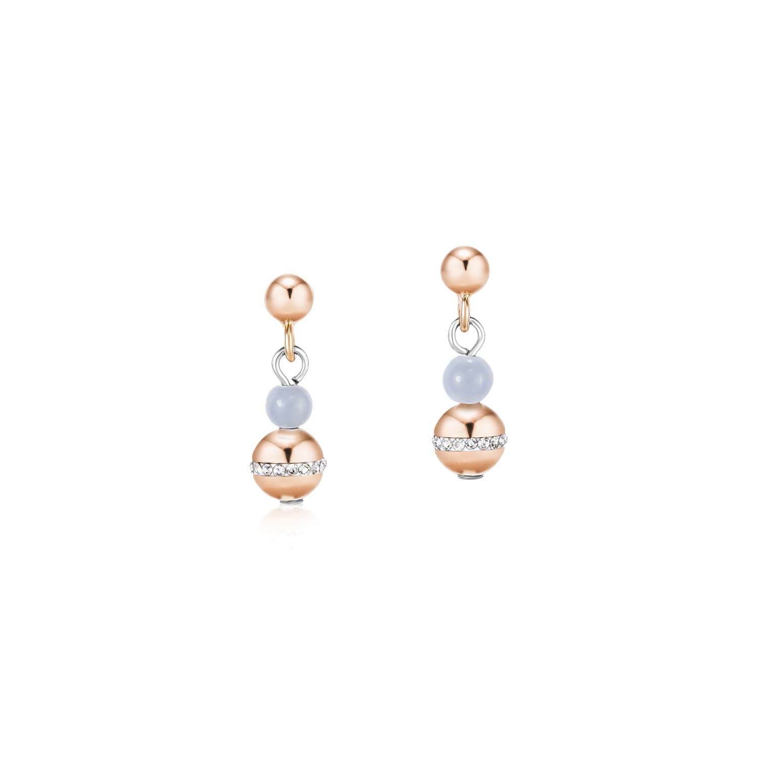 A pretty pair of drop earrings in sky blue angelite and rose gold plated stainless steel beads set with pavé-set crystals.