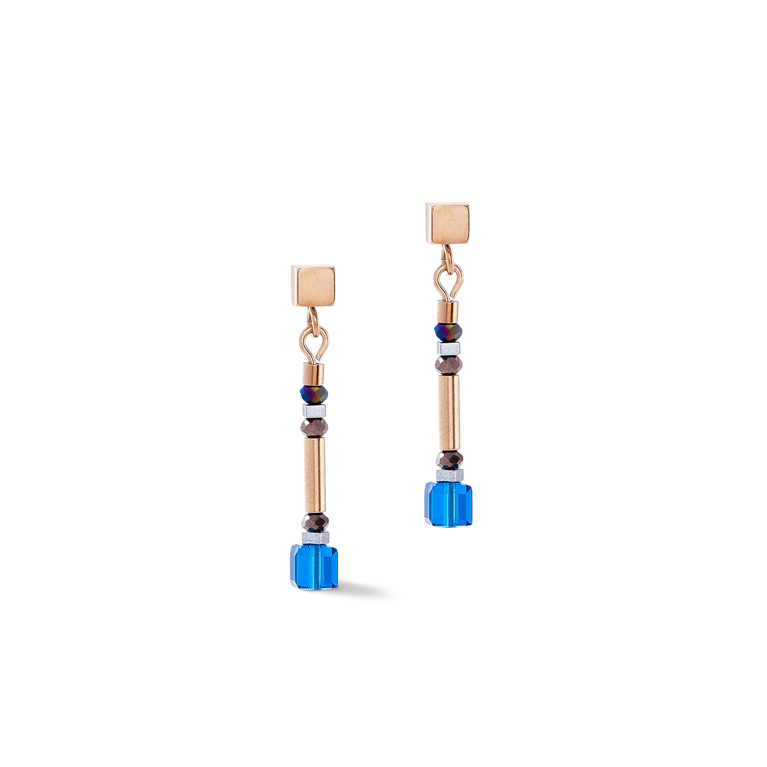 Cube Story Minimalistic Sparkling Earrings Multicolour Autumn – Understated elegance with a colourful accent The Cube Story Minimalistic Sparkling Earrings in the Multicolour Autumn version combine simple elegance and vibrant colours in perfect harmony. These stylish earrings feature a minimalist design with a shimmering mix of colours that is ideal for the autumn season. The combination of delicate, dark metal tones and bright colour accents such as blue give these earrings a modern yet timeless look. Thanks to their subtle length and slim design, the earrings are versatile and can be worn as an elegant splash of colour in everyday life or as a stylish accessory for special occasions. The carefully selected pearls and cubes create a harmonious interplay of colours that adds a special touch to any outfit. Perfect in combination with the matching necklace or as a stand-alone highlight – the Cube Story Minimalistic Sparkling Earrings Multicolour Autumn are the ideal accessory for anyone who values modern, understated elegance and also has a penchant for colour.