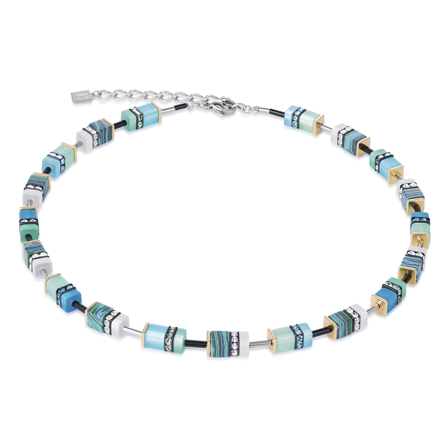 A sparkly necklace with polaris , rhinestone rondelles, synthetic malachite and gold plated stainless steel. This necklace has blue, turquoise, black and white colour ways.