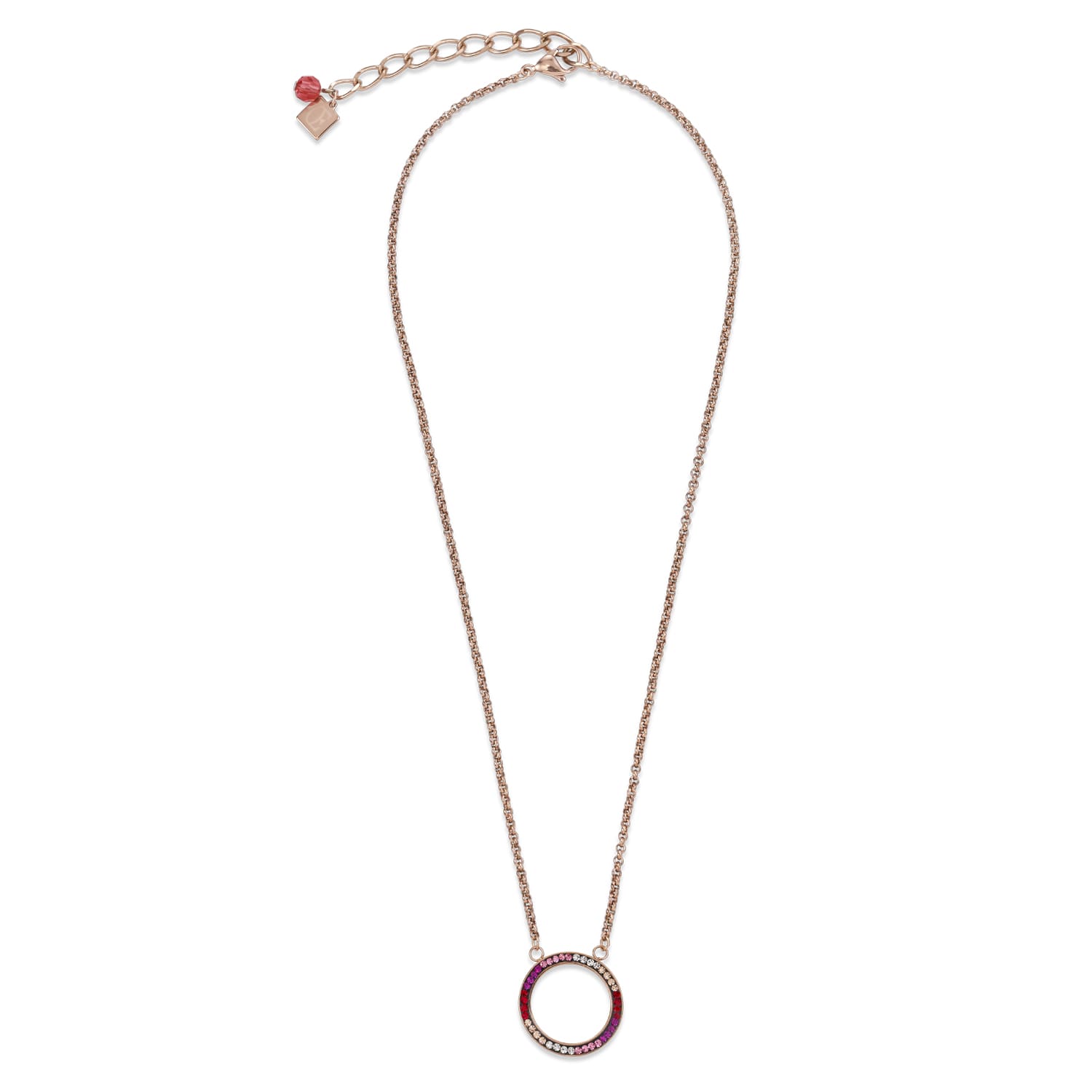 A sparkly necklace with pink shaded crystals on rose stainless steel.