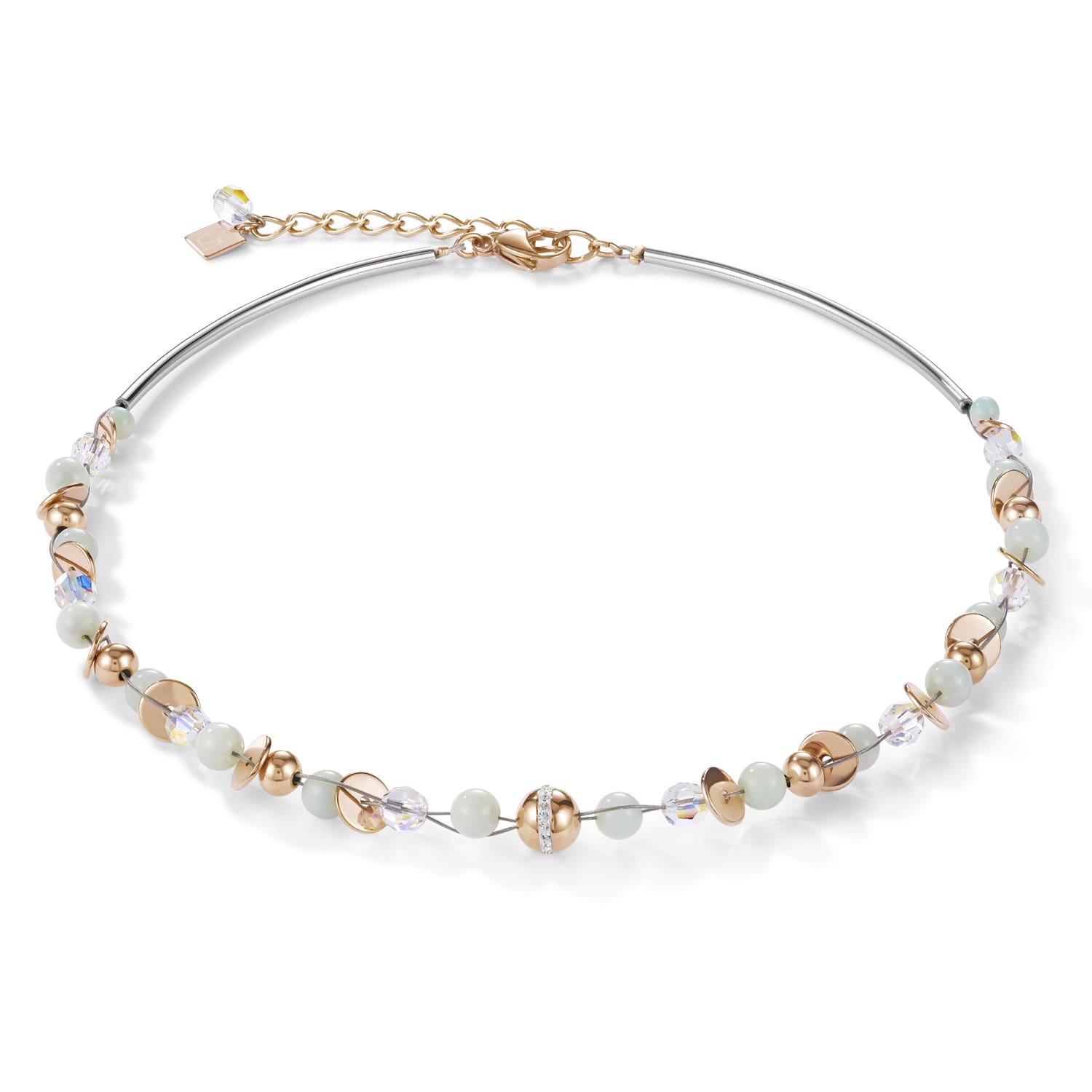 Twisted pearls: Amazonite, pavé-set crystals and stainless steel and brought together in an extraordinary composition in shades of soft mint green.