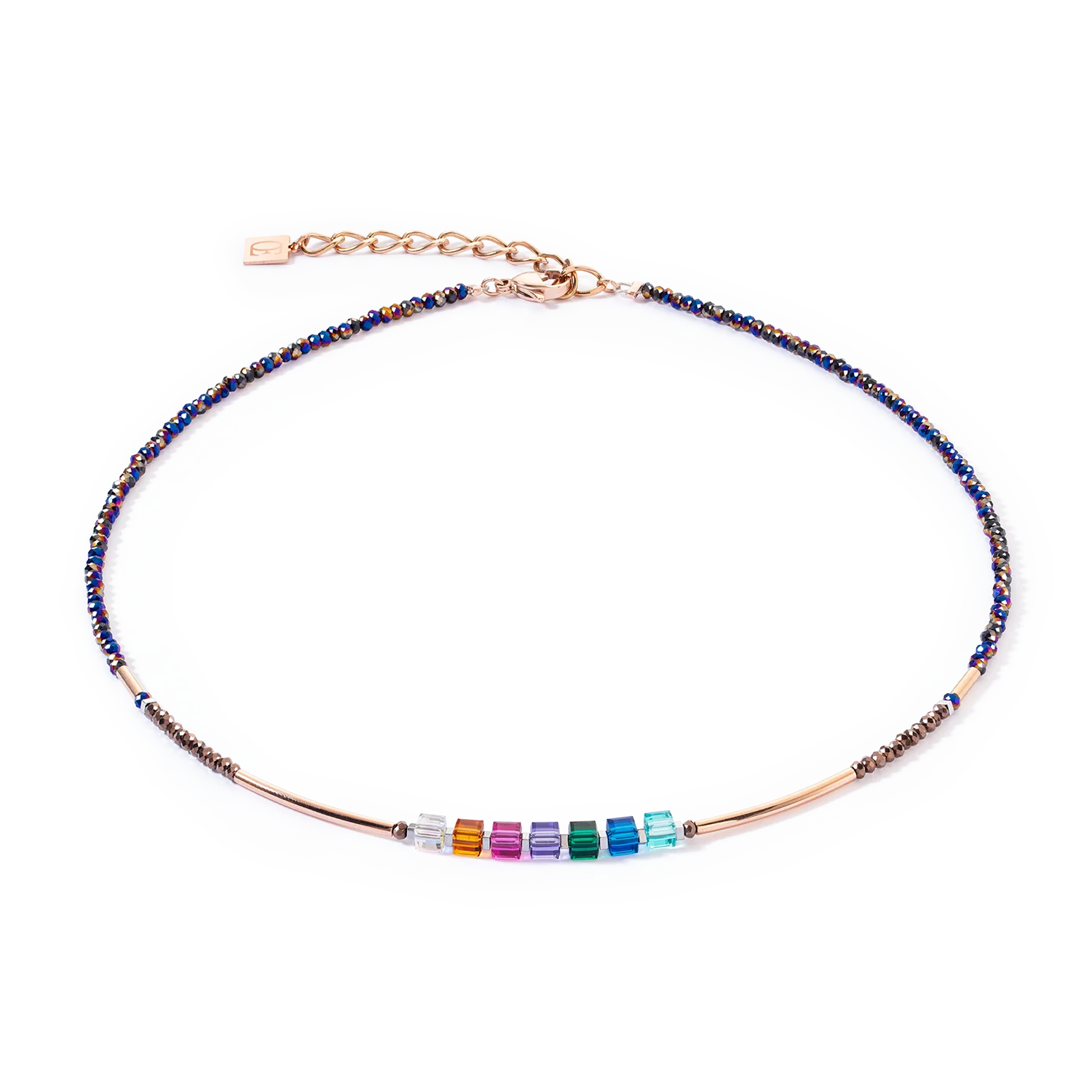 Cube Story Minimalistic Sparkling Necklace Multicolour Autumn – play of colour meets modern elegance Add a touch of colour and sophistication to your look with the Cube Story Minimalistic Sparkling Necklace in the Multicolour Autumn version. This trendy necklace combines understated elegance with a sparkling mix of colours that is perfect for the autumn season. The minimalist cubes in bold colours such as turquoise, blue, green, purple, pink and orange, framed by rose gold elements and sparkling crystal beads, give the design a modern, glamorous touch. The delicate rose gold plating and filigree design make this necklace a versatile accessory that is perfect for everyday wear as well as special occasions. The dark multicolour nuances create a stylish yet eye-catching look that can be wonderfully combined with other pieces of jewellery. Whether worn solo or in a layered look, the Cube Story Minimalistic Sparkling Necklace Multicolour Autumn makes a fashion statement and brings a breath of fresh air to your jewellery collection. Perfect for anyone who loves modern elegance with a touch of colour!