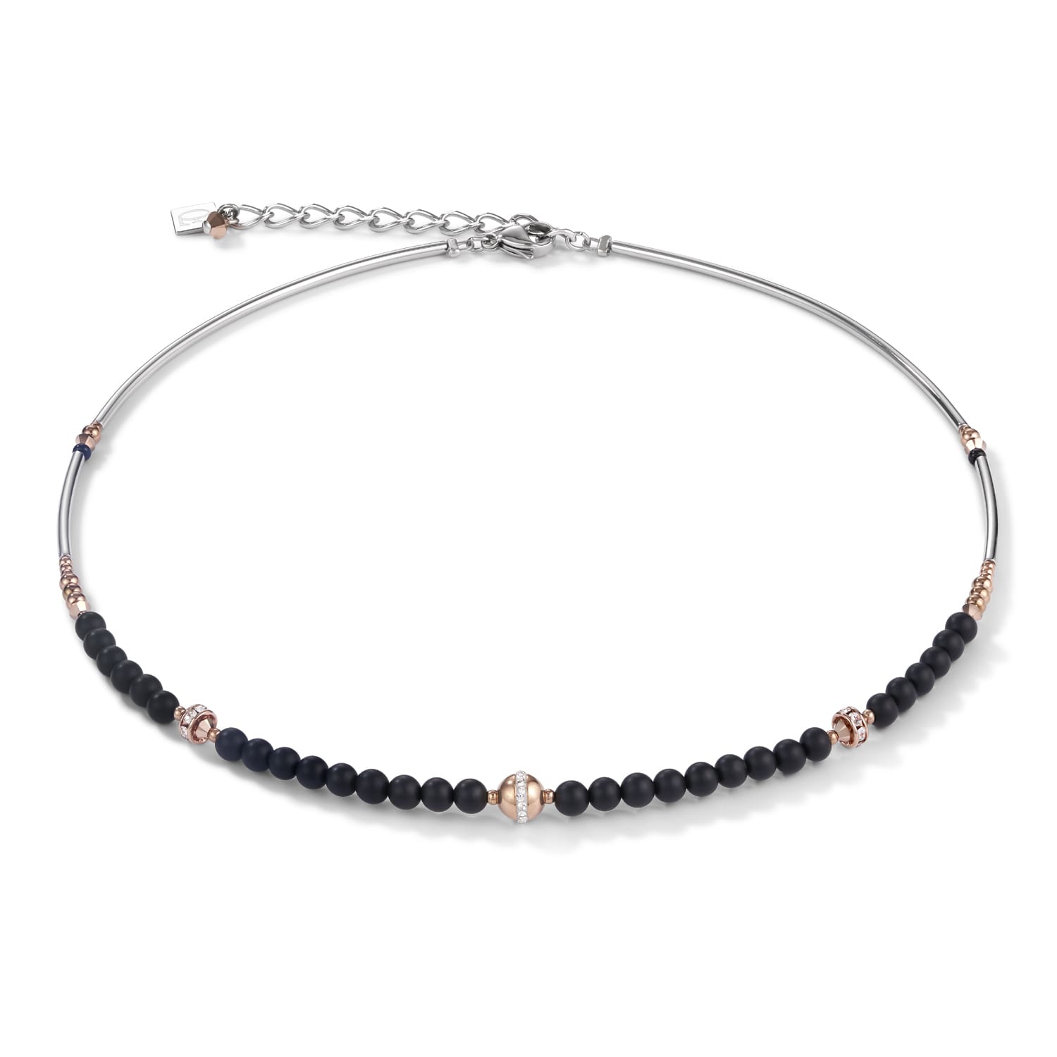 Deep black. The height of elegance. A delicate necklace handmade from onyx and rose gold plated stainless steel beads set with pavé-set crystals.