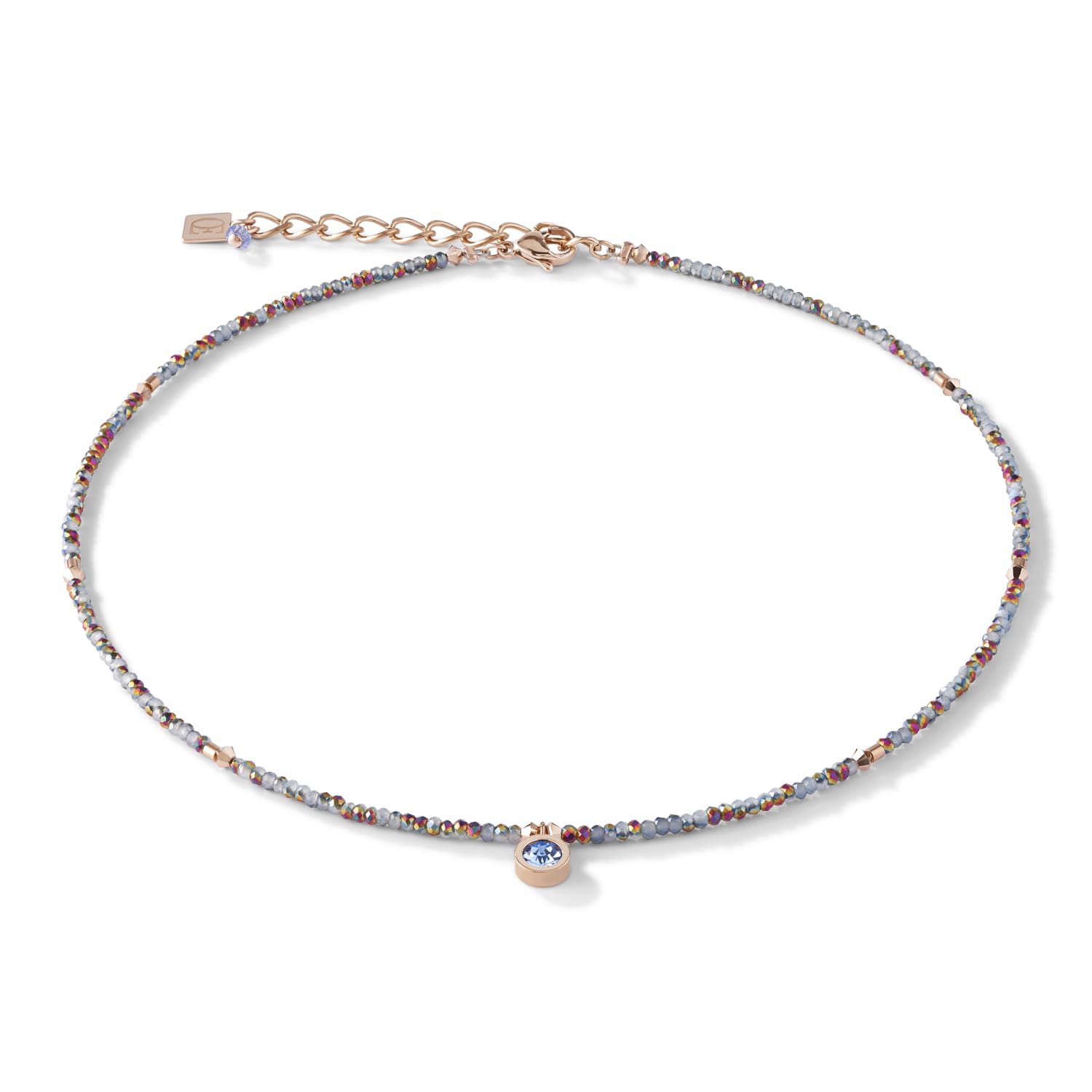 A real showpiece: a fine necklace in light blue featuring a cornflower blue crystal set in rose gold plated stainless steel.