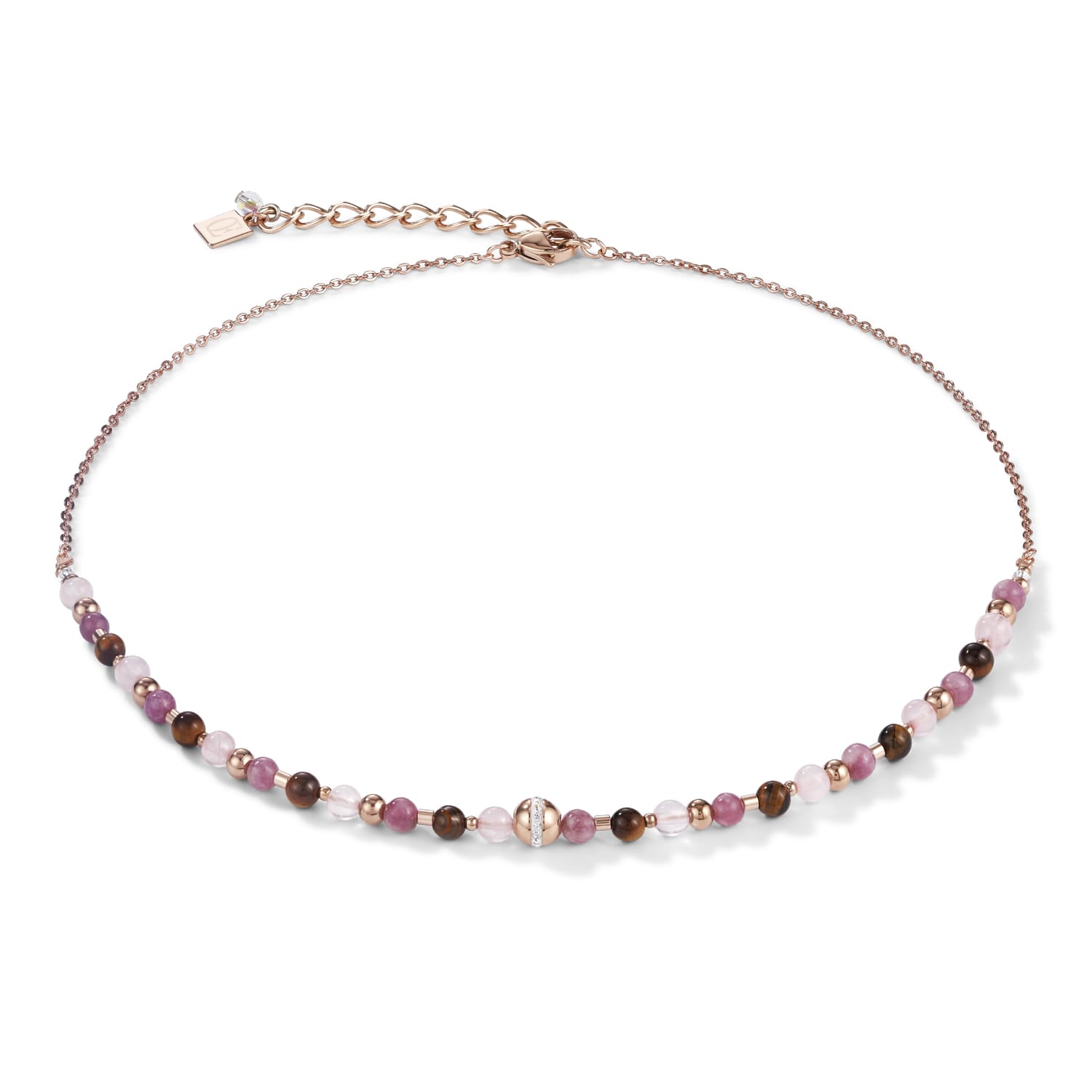 A beauty that will warm your heart: a fine necklace with real stones such as rose quarts and lepidolite, in shades of lilac and brown.