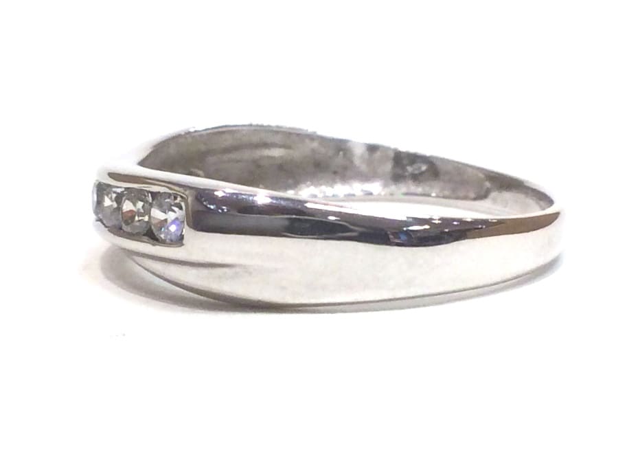 A modern crossed bands design ring channel set with round cut Cubic Zirconia.Metal: 9 carat white goldWidth: 5 mmFinger Size: P – This ring is unsuitable for resizing.As a pre owned item, this ring has been examined and professionally cleaned and polished in our workshop.Gift Boxed