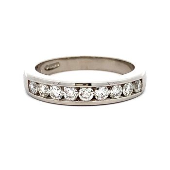 A bright row of seven round cut Cubic Zirconia channel set in yellow Gold.Metal: 14 carat yellow goldWidth: 5 mmFinger Size: Q – This ring is unsuitable for resizing.As a pre owned item, this ring has been examined and professionally cleaned and polished in our workshop.Gift Boxed