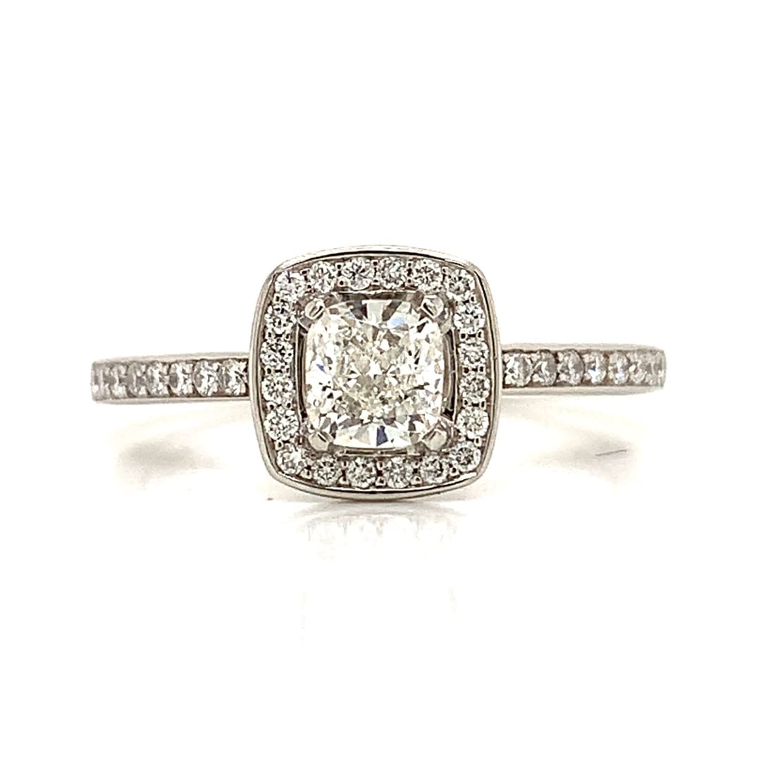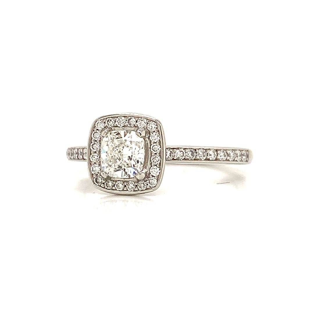 A beautiful cushion cut diamond claw set within a diamond pave surround and diamond pave sweeping shoulders. This platinum ring is designed to allow a wedding band to sit under the setting.