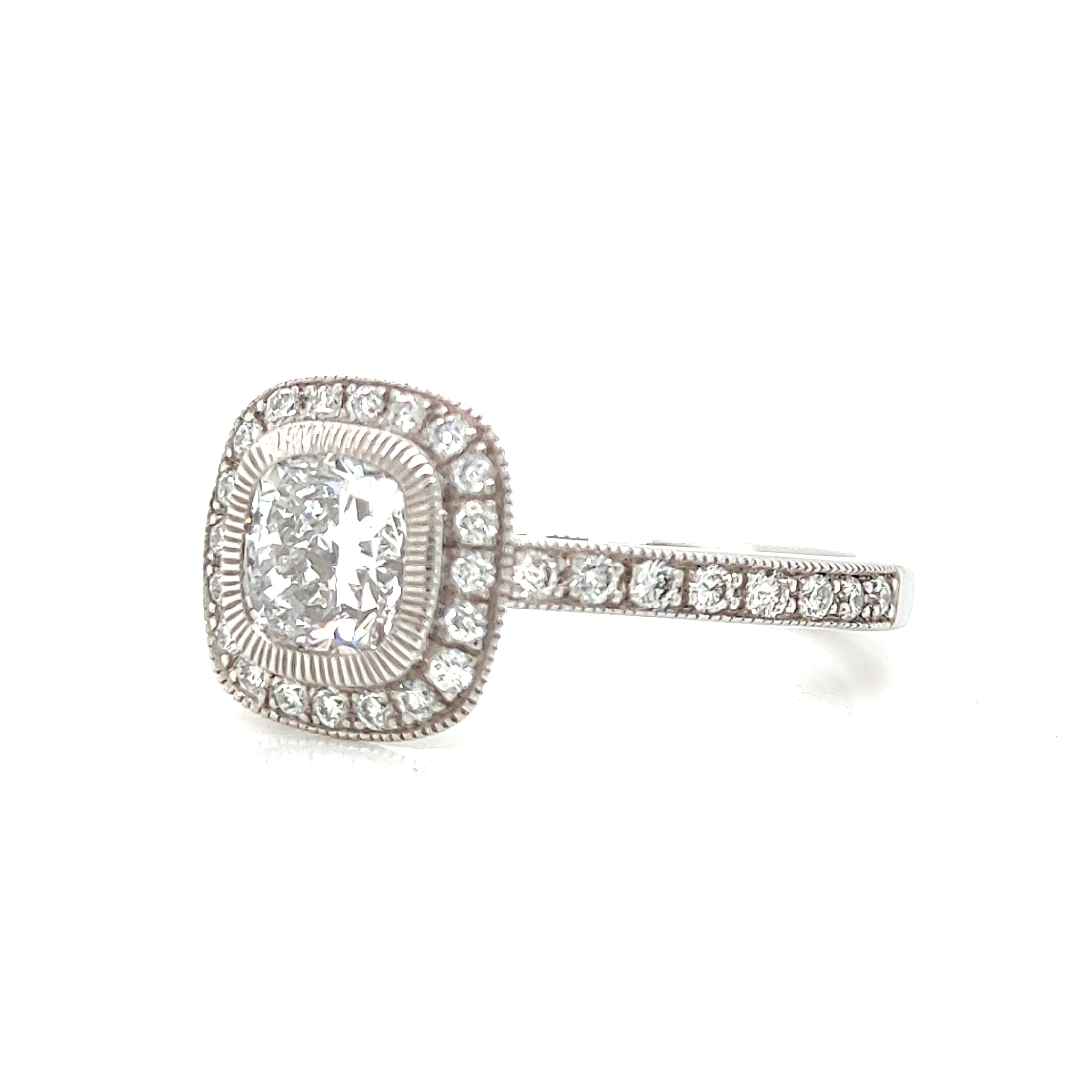 A beautiful cushion cut diamond claw set within a diamond pave surround and diamond pave sweeping shoulders. This platinum ring is designed to allow a wedding band to sit under the setting.