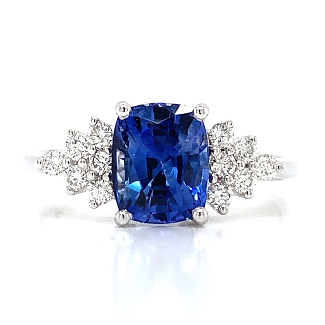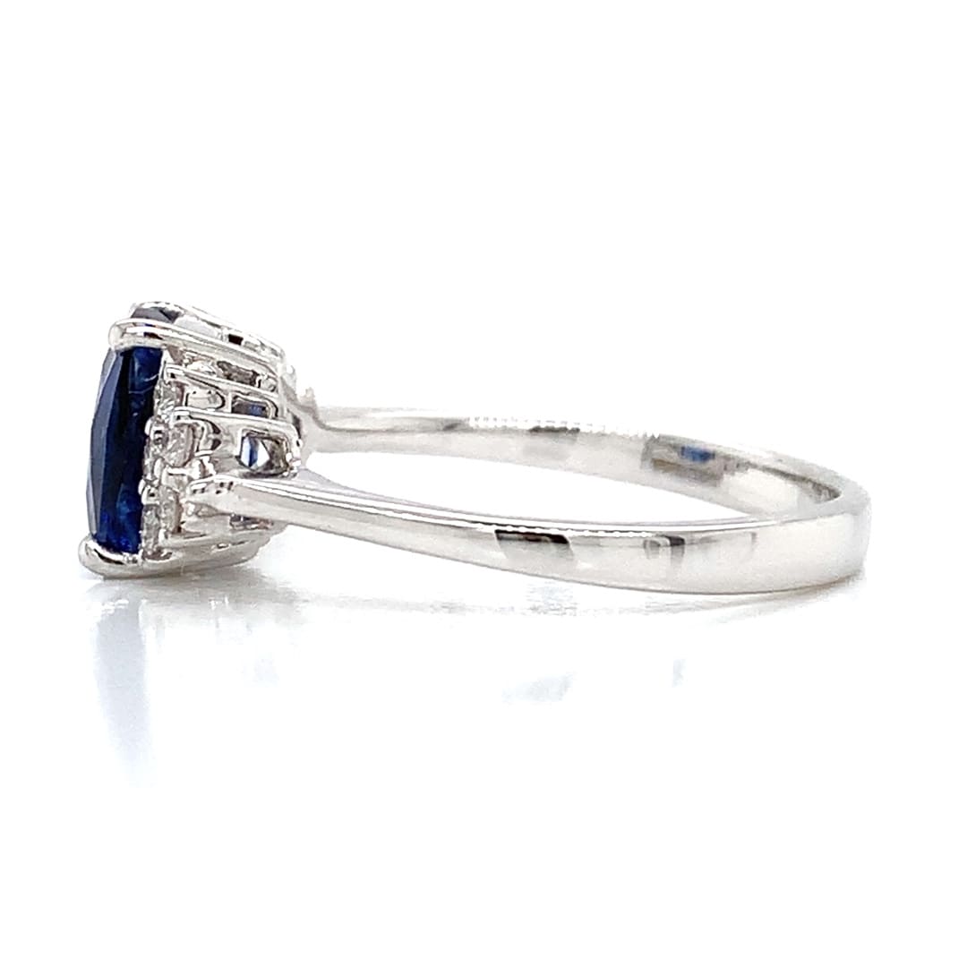 A lovely elyptical design dress ring claw set with a cushion cut blue sapphire and bright round cut Diamonds.