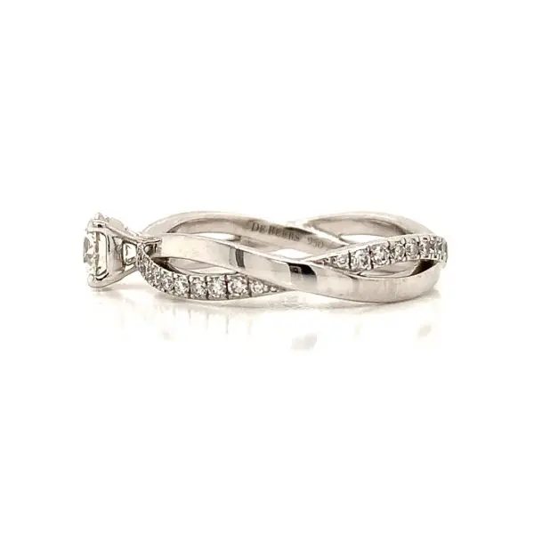 A gorgeous engagement ring by De Beers, with a central brilliant cut diamond in a four claw setting over a woven effect band pave set with bright round cut diamonds. With original boxes and paperwork including a diamond certificate.