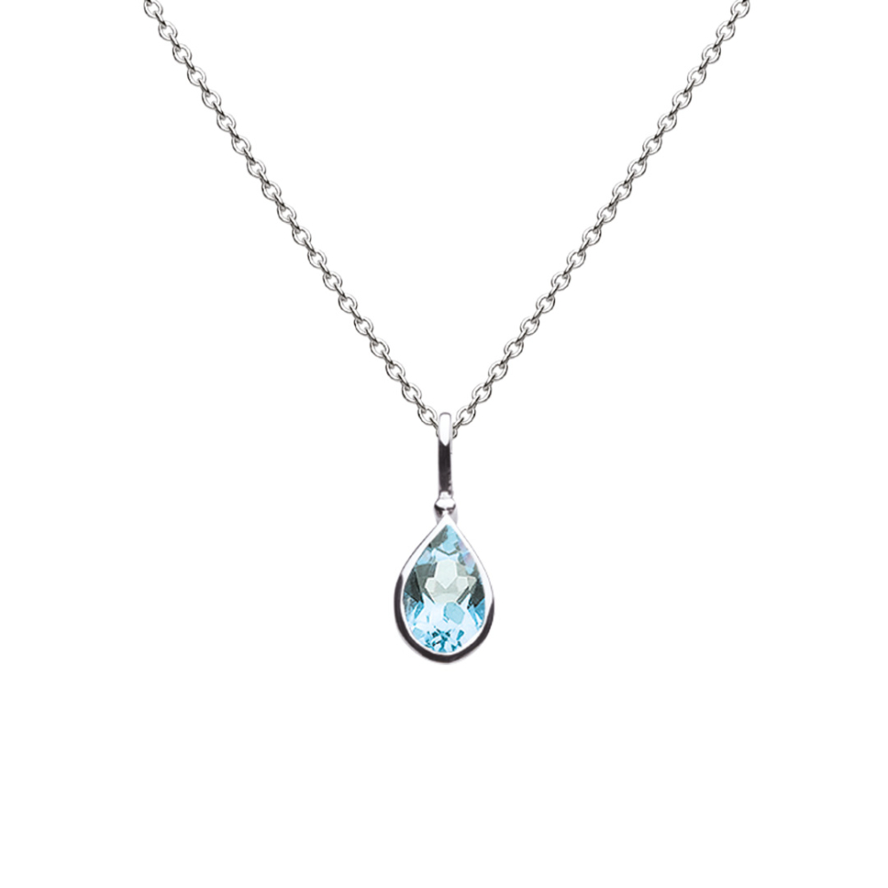 Attractive Blue Topaz teardrop pendant. Set on a sterling silver 18″ chain.
